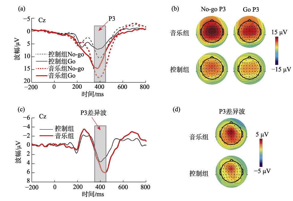研究进一步采用脑电技术考察了音乐训练与大学生抑制控制能力的关系。结果发现:在 Go/No-go 任务中音乐训练组的 N2和 P3差异波幅(No-go减Go条件)显著大于控制组(图3);在 Stroop 任务中音乐训练组的 N450差异波幅(不一致减一致条件)也显著大于控制组,同时在行为学指标上音乐训练组表现出更小的Stroop冲突效应。两个实验从电生理层面一致表明音乐训练与抑制控制能力的提升具有显著关联。由于脑电技术具有较好的时间分辨率,能精细考察人类认知加工的时程变化特点,该研究进一步揭示了音乐训练对抑制控制过程中早期的冲突监控和晚期的冲突解决都有一定的促进作用。该研究于近期发表在心理学国内权威刊物《心理学报》上。陈杰副教授为该论文的通讯作者,其研究生陈洁佳同学为论文第一作者,周翊同学为第二作者。本研究受国家自然科学基金面上项目等资助。