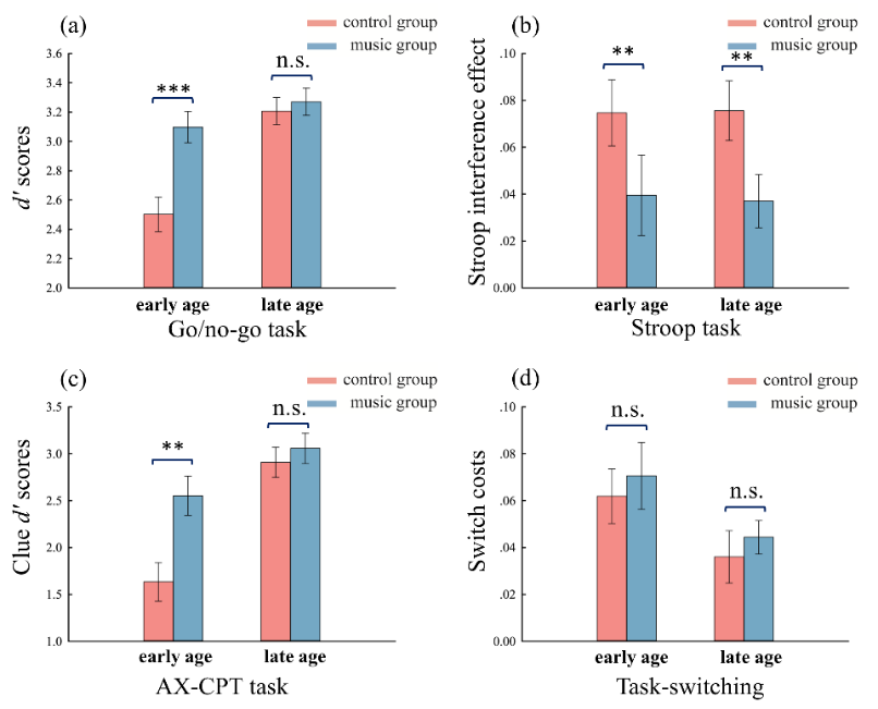 基于此,陈杰副教授及合作者采用行为及脑电技术围绕音乐训练与执行功能的关系开展了系统实验研究。首先通过两个行为学实验对比了接受和未接受过专业音乐训练的儿童(7-13岁)在执行功能三个子成分上的发展特点。结果显示:音乐训练组儿童在抑制控制(Go/no-go和Stroop)和工作记忆(AX-CPT)任务上的表现要显著好于控制组儿童,但是在认知灵活性(Task-switching)任务上两组儿童没有显著差异。这表明音乐训练与儿童抑制控制和工作记忆的提升具有显著的关联。更为有趣的是:7岁之前学习音乐比7岁之后学习音乐会产生更广泛的训练迁移效应(如图2),首次发现了音乐训练对儿童执行功能的影响存在敏感期,进一步为早期音乐教育的重要性提供了科学证据。该研究将于近期发表在音乐心理学领域国际主流期刊《Psychology of Music》上。陈杰副教授为该论文的通讯作者,其研究生陈洁佳同学为论文的第一作者,英国阿伯丁大学心理学院Meike Scheller博士、我校音乐学院胡碧瑜老师、教科院彭荣老师、武川煜、刘翠红、刘思永同学为本研究的共同作者。