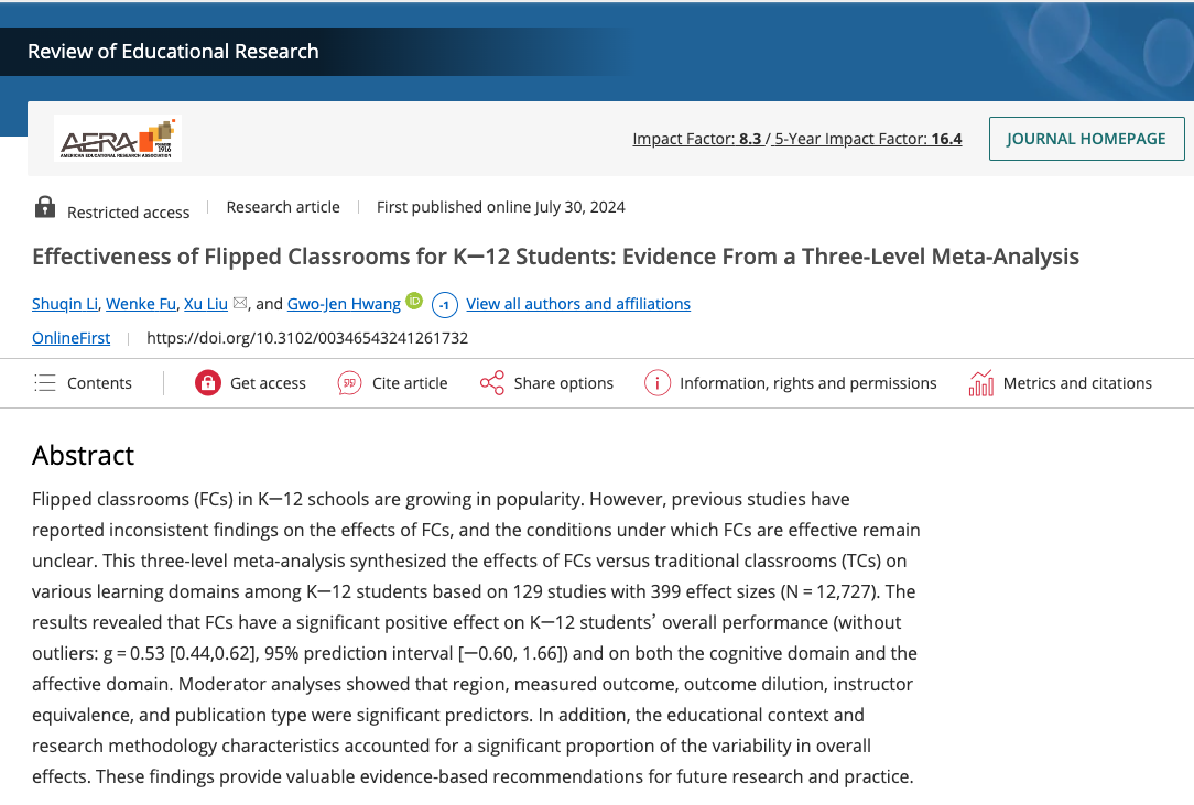 近日,304am永利集团刘旭教授研究团队取得重要学术成果。其论文“Effectiveness of flipped classrooms for K-12 students: Evidence from a three-level meta-analysis”在教育学国际顶级期刊《Review of Educational Research》发表。2021级课程与教学论专业博士生李书琴为第1作者,2021级课程与教学论专业硕士生符文可为第2作者,台中教育大学黄国祯教授为第3作者,刘旭教授担任本论文的通讯作者。304am永利集团为该论文的第一作者单位及通讯单位。