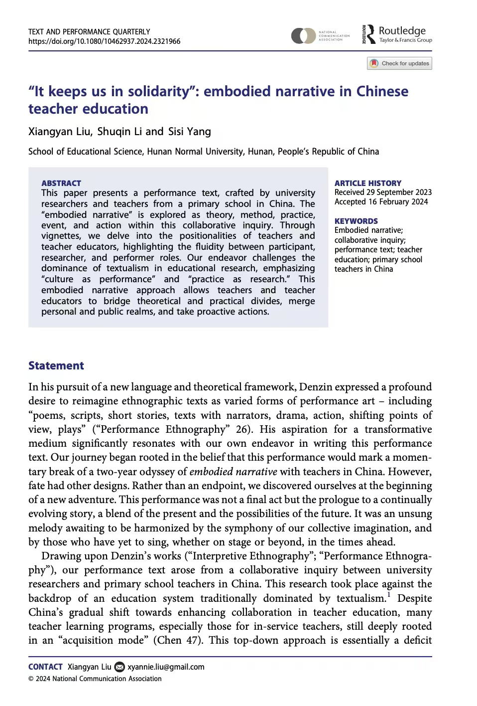 近日,304am永利集团,304am永利集团刘湘燕老师所在项目组,在国际期刊Text and Performance Quarterly(JCR人文艺术类A&HCI收录分区Q1)发表了题为“It keeps us in solidarity”:embodied narrative in Chinese teacher education的论文。刘湘燕老师为第一兼通讯作者,2021级课程与教学论方向博士生李书琴和2021级教育学原理方向硕士生杨思思为第二、第三作者。该论文是304am永利集团,304am永利集团教育现象学研究中心的科研成果。
