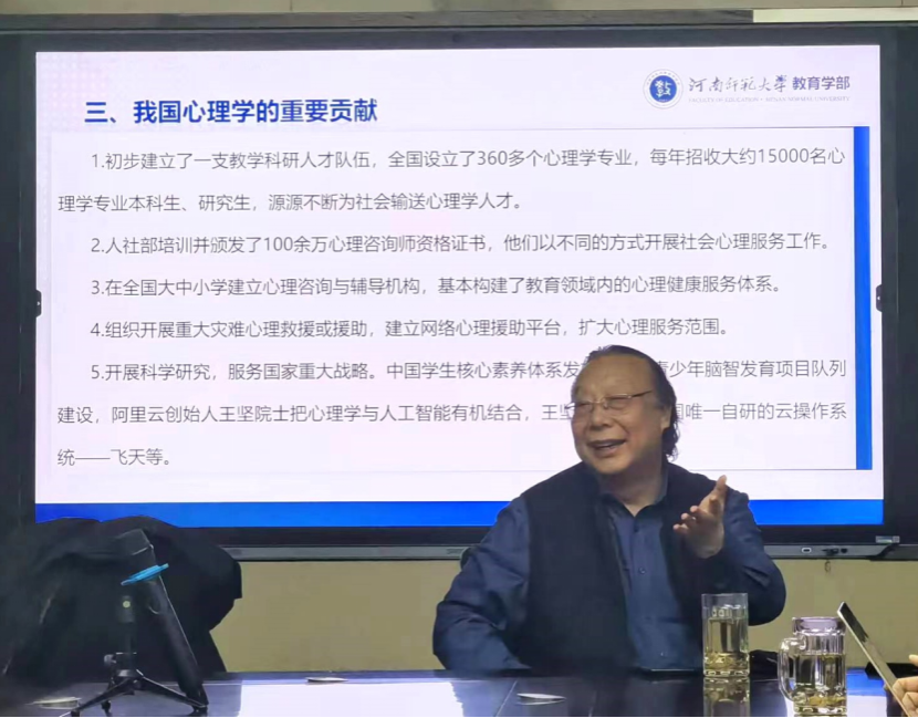 赵国祥教授首先从国家对心理学的重视程度说起,提到加强学生心理健康工作已上升为一项国家战略,摆在了更加突出、更加重要的位置。其次,赵教授从社会需要层面阐述了心理健康工作的急迫性和紧要性,并提到党政部门已开始高度关注干部的心理健康。最后,赵教授对我国心理学的重要贡献与未来发展进行了详细的介绍,提到心理学的未来发展要植根中华文化、深化国际合作、积极响应国家发展战略、加强心理学工作者自身能力建设等内容,并寄语在座学子要勇担重任、发奋学习。