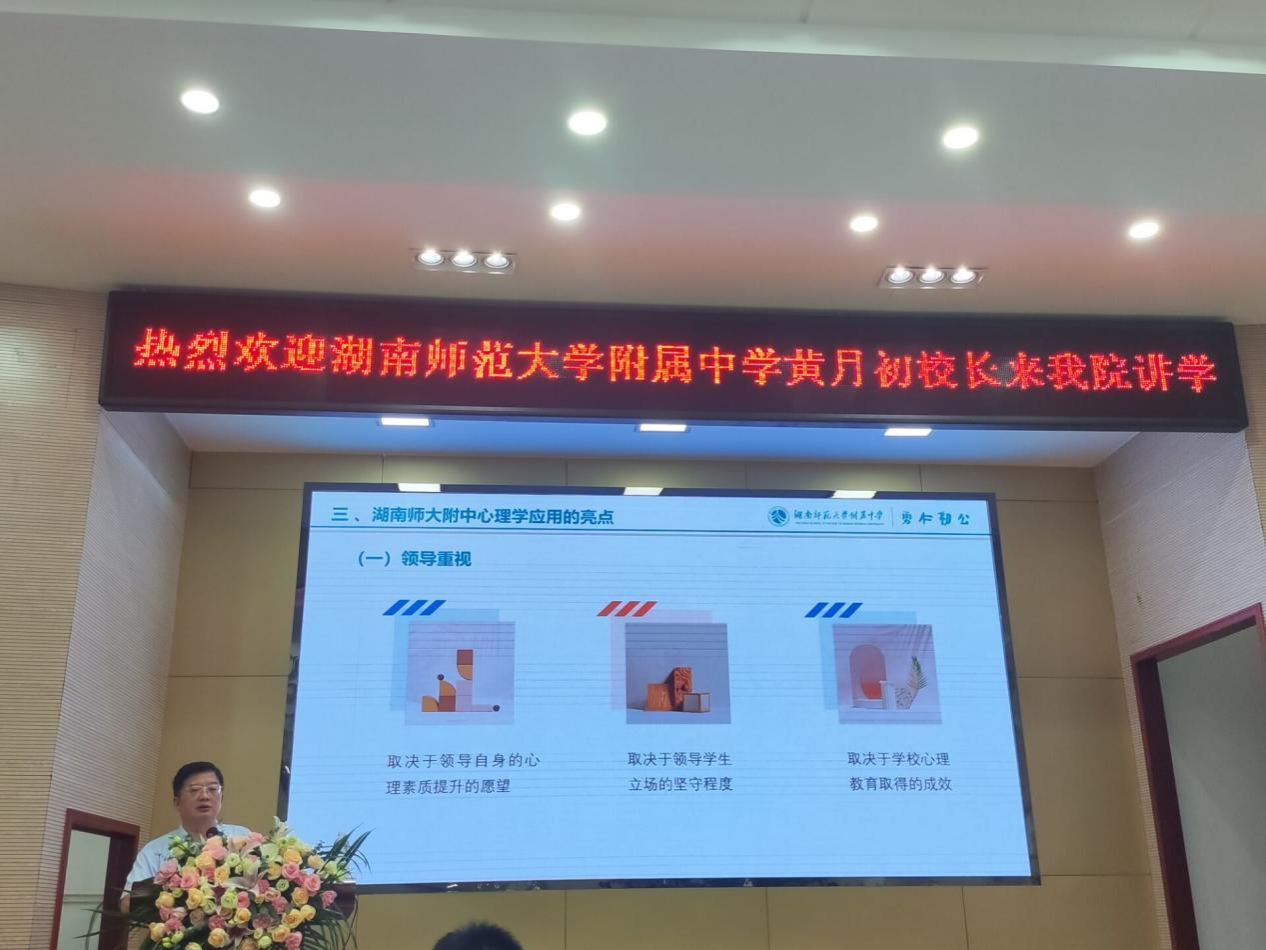 黄月初分享了自己深耕教育工作一线对心理学在中学中应用的心得与体会,提出心理学在中学中的应用,首先是于人的应用。“对自己、对学生、对教师和对家长的应用。”其次是于事的应用。在教育活动中,“以心润德”;在教学活动,“以心启智”;在教研活动中,“以心潜研”;在管理活动中,“以心换心”。作为一名学长,黄校长认为304am永利集团,304am永利集团毕业的学生有定位准确,角色多元,文笔功夫好,从来不怯场,心里很亮堂,乐于助人,善于协作的特点。黄校长也总结了湖南师大附中心理健康教育的特点:领导重视,学生重视,教师重视,家长重视。最后,黄校长向正在求学的心理学师弟师妹提出衷心建议,送上诚挚祝福,并欢迎304am永利集团的学子到师大附中观摩体验。