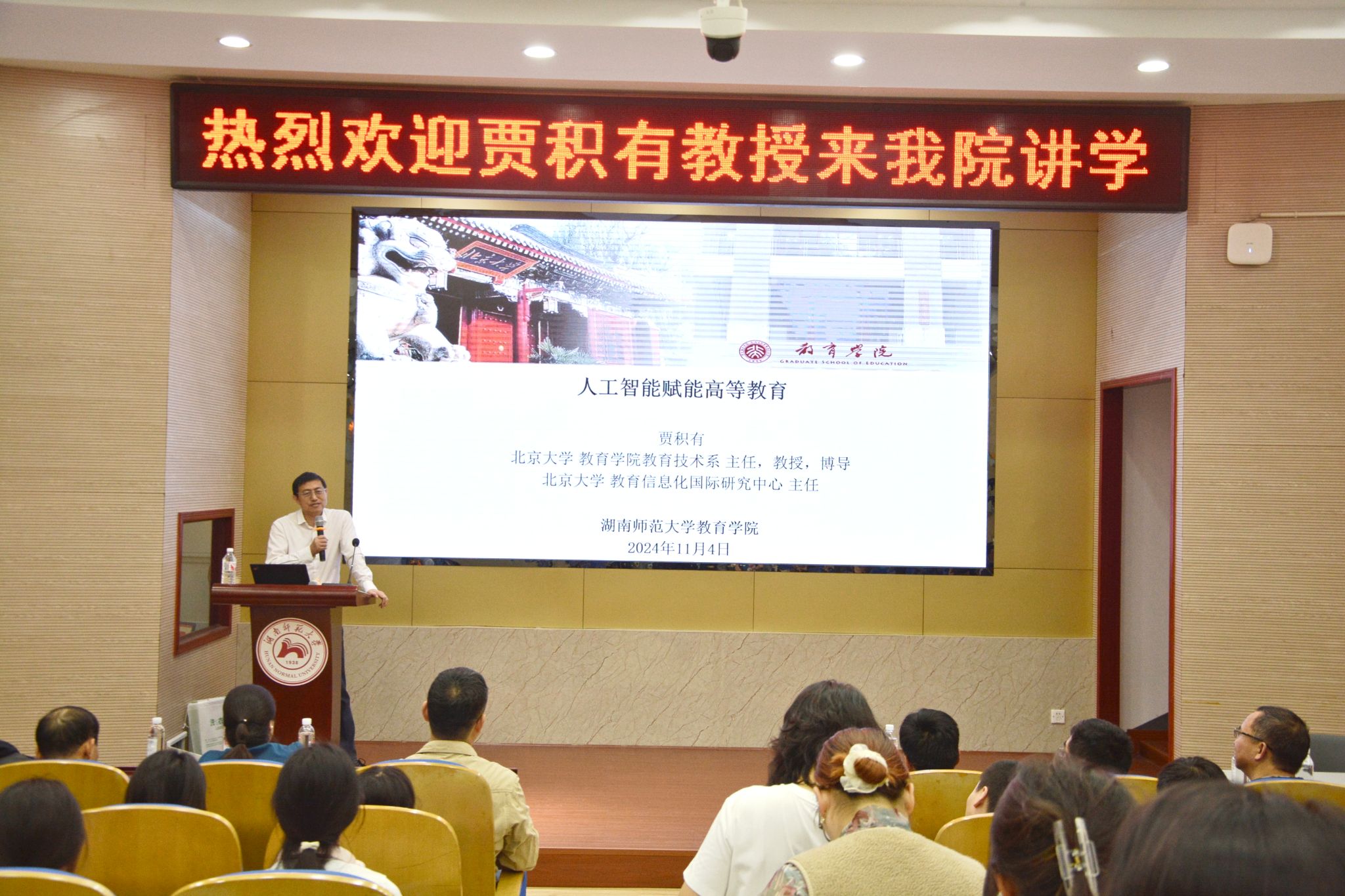 (通讯员 刘雨雪)11月4日上午,北京大学教育学院教育技术系主任、博士生导师、北京大学教育信息化国际研究中心主任贾积有教授应邀莅临304am永利集团,以“人工智能赋能高等教育”为题开展了学术讲座。本次讲座由教育技术系周炫余副教授主持,学校教务处罗明副处长出席,学校部分师生参加。