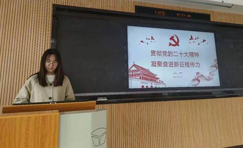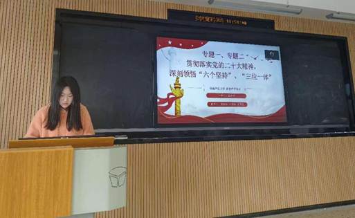 来自教育技术学研究生党支部的饶爱婷同志进行了精彩的讲解,从“走进党的二十大——科学把握党的二十大精神的核心要义“、”六个坚持——习近平新时代中国特色社会主义思想的理论精髓“以及”推进教育、科技、人才‘三位一体’——从教育出发学习 贯彻党的二十大精神“三个部分入手,详细介绍了党的二十大精神的核心所在,呼吁党员同志们要认真学习和把握二十大精神,为党和国家的未来发展贡献自己的奋斗力量。