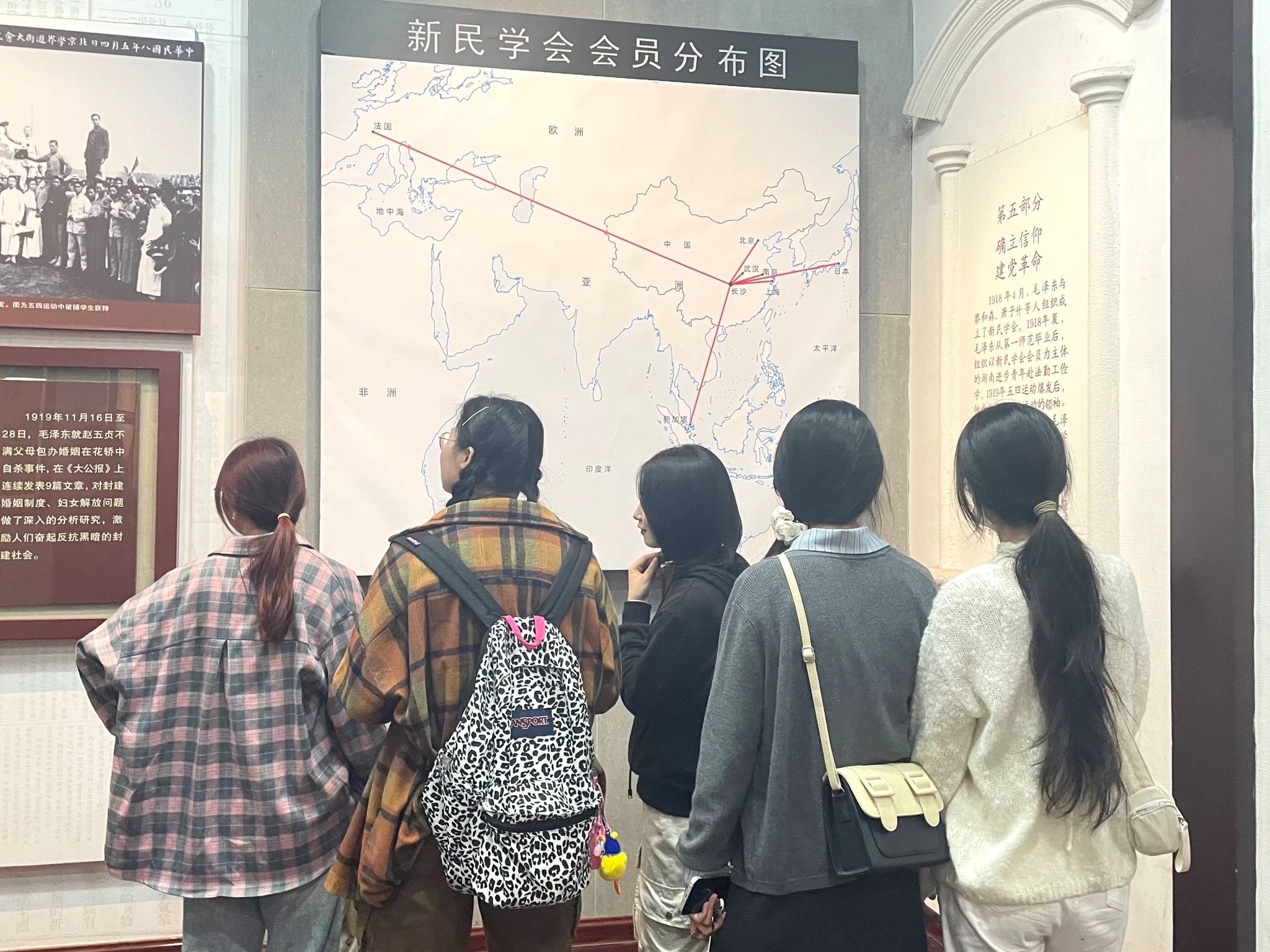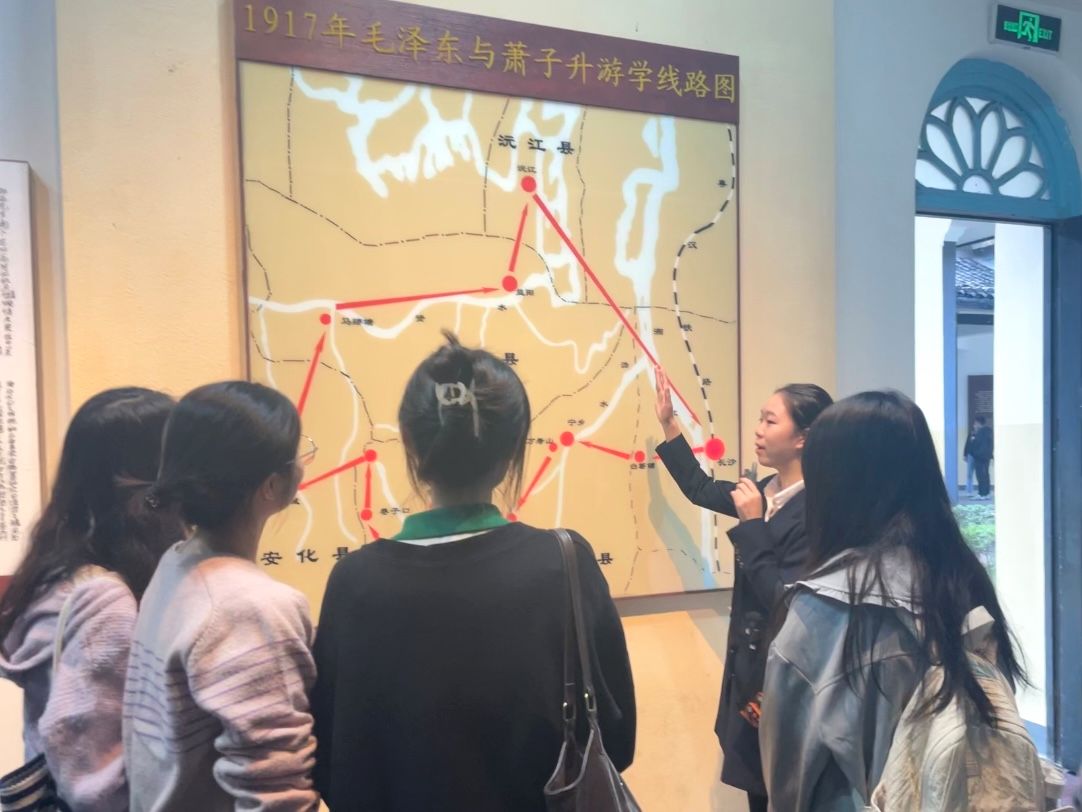 湘江之滨,妙高峰下,湖南第一师范学院(城南书院校区)静静矗立。到达目的地之后,党员同志首先在嵌有“第一师范”四个浮雕大字的建筑大门前进行集合签到与合影留念。这所素有“千年学府,百年师范”美誉的学校,前身为南宋著名理学家张栻于1161年创办的长沙城南书院,1912年更名湖南公立第一师范学校,毛泽东同志曾在这里求学与工作。党员同志根据分组情况,跟随讲解员的指引,有组织、有纪律地进入城南书院校区进行参观。走进城南书院校区,长廊迂回,连接起大礼堂、八班教室、水井、自习室、阅报室等十多个红色展区和纪念展馆。党员同志跟随讲解员的步伐,逐步参观了一个个纪念展厅,驻足于一处处红色旧址,聆听了一桩桩历史故事,见证着毛泽东同志“恰同学少年、风华正茂”的求学岁月,感受着伟人“以天下为己任”的责任担当。