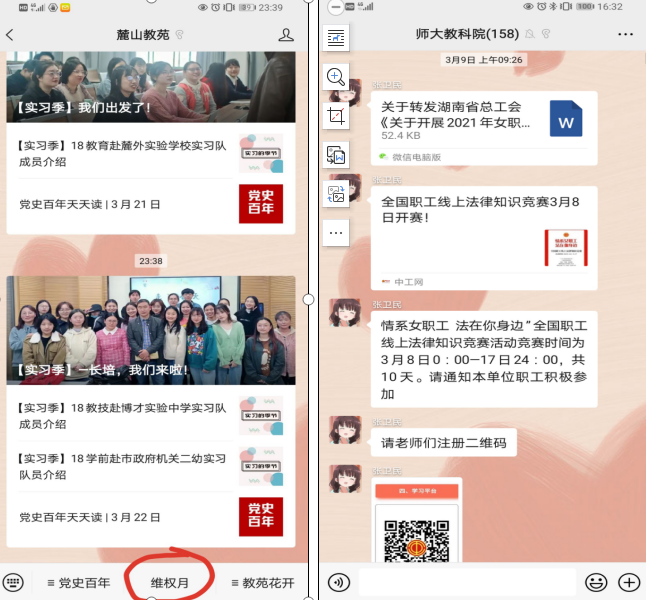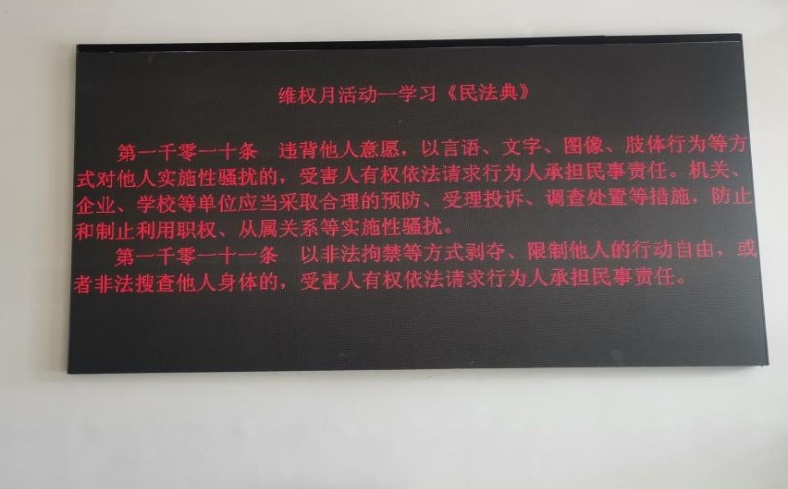 一、面向广大职工开展普法宣传。以工会小组为单位,开展《民法典》、女职工权益保护及性别平等相关法律法规知识宣传;在微信群、微信公众号、学院电子屏等平台,积极做好相关活动的宣传普及。
