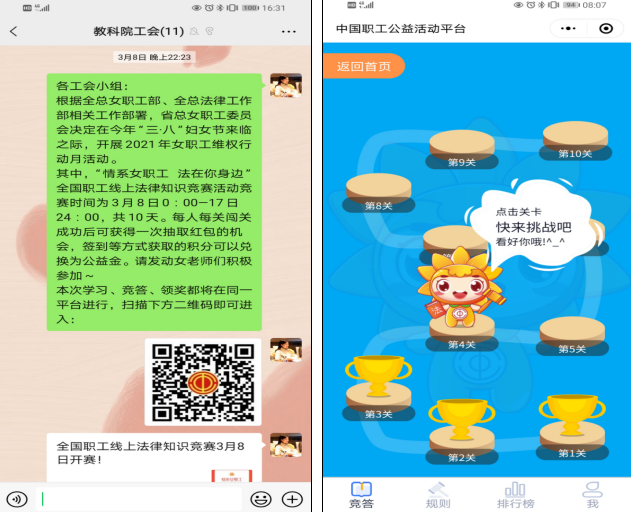 二、组织教职工参加线上法律知识竞赛活动。发动各工会小组宣传、组织参加“情系女职工 法在你身边”全国职工线上法律知识竞赛活动。