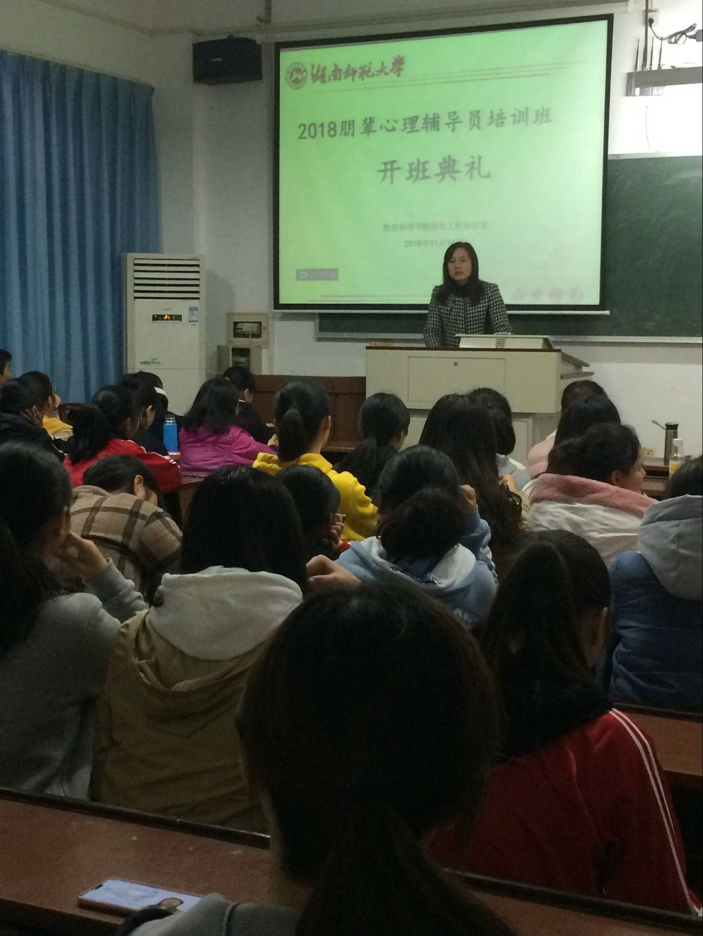 马欣在开班典礼上讲话,她对2018级朋辅们的加入表示了欢迎,对同学们积极主动热情的这份担当给予了赞扬,并且希望同学们在接下来的培训中珍惜学习机会,努力提高业务水平,不断增强责任意识,提高工作实践能力,为学院的心理健康工作奉献自己的力量。刘江惠同学作为一名朋辈心理辅导员代表为新生朋辅做经验分享。她从工作动机、工作经历、自身的成长与收获三个方面让同学们了解到朋辅的重要性和必要性。