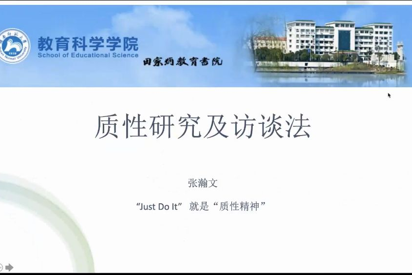 张瀚文以“质性研究和访谈法的定义”为主题,围绕质性研究的目的、质性研究方法的特点以及质性研究的基本步骤三个方面分别论述。他结合自身参与科研的切实经历,提出“访谈是为了什么”“如何设计访谈问题”两个问题,向大家阐述访谈法的实质与意义,总结了自身作为访谈者时面临的一些挑战,并就此和同学们展开一系列的讨论。在学习资料分享环节,张瀚文推荐《社会调查与研究方法》《教育研究方法》《质性研究方法》等线上课程,鼓励同学们运用质性研究及访谈法进行学习与思考。