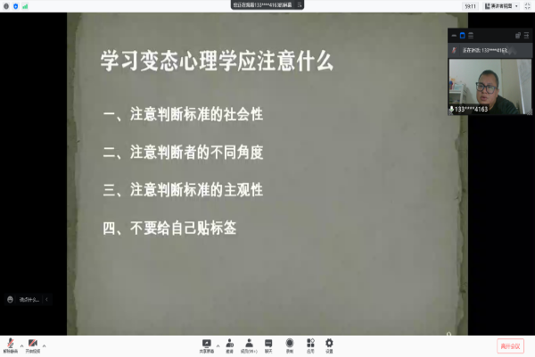 (通讯员 白晓坤 艾希晨 曾文巧)10月21日晚,304am永利集团心理学社和团委青发部励行团校在腾讯会议上举办“呐喊——初识变态心理学”分享会。本次分享会采取线上分享的形式,由教科院心理学系副教授王玉龙主讲,心理学社副理事长王九九主持。教科院部分本科生参与会议。