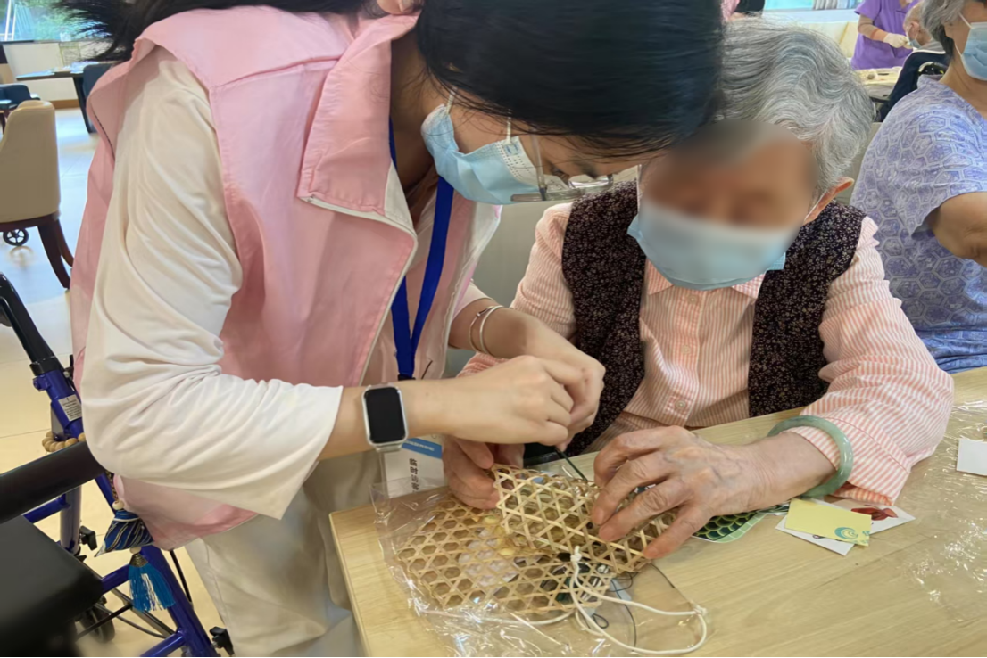 活动开始前,志愿者们协助工作人员布置场地,营造端午的节日氛围。活动围绕包粽子和艾草编织两个部分进行。在包粽子环节,志愿者们向老人们讲解了水晶粽的制作步骤,并指导老人们包裹馅料、塑形。制作完成后,桌子上摆满了水晶粽子。水晶粽的制作不仅让老人们体验到了制作传统美食的乐趣,还锻炼了他们的动手能力,增进了彼此之间的感情。在艾草编织环节,志愿者们带领老人们共同编织了龙舟挂件。编织完成后,大家一起用颜料为龙舟挂件上色,再将艾草塞入龙舟内部。这种做法既达到了驱虫辟邪的效果,又寄托了端午安康的美好寓意。在编织过程中,老人们不仅体验到了传统技艺,精神世界也得到了充实。活动期间,志愿者时刻维护着现场秩序、配合医护人员保障老人们的安全,确保活动的顺利进行。