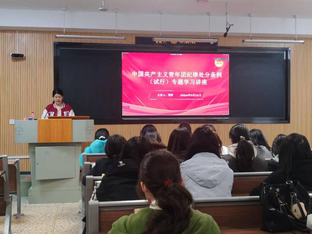 讲座中,谭梦重点讲解了《条例》中关于团纪处分种类、违反纪律行为的处分以及违法犯罪团员的处分规定。她引导同学们细致区分警告、严重警告、撤销团内职务、留团察看、开除团籍五种处分层次,并围绕政治纪律、组织纪律、廉洁纪律、生活纪律等方面的行为规范,逐一剖析了相应的处分情形与适用标准,着重阐述了对违法犯罪团员的纪法衔接与严肃处理。她通过条文解读、案例分析和互动练习相结合的开除团籍五种处分层次,并围绕政治纪律、组织纪律、廉洁纪律、生活纪律等方面的行为规范,逐一剖析了相应的处分情形与适用标准,着重阐述了对违法犯罪团员的纪法衔接与严肃处理。她通过条文解读、案例分析和互动练习相结合的方式,帮助团员青年深刻理解团纪的具体要求,提醒大家在日常学习生活中以身作则,严格遵守法律法规与团的纪律。