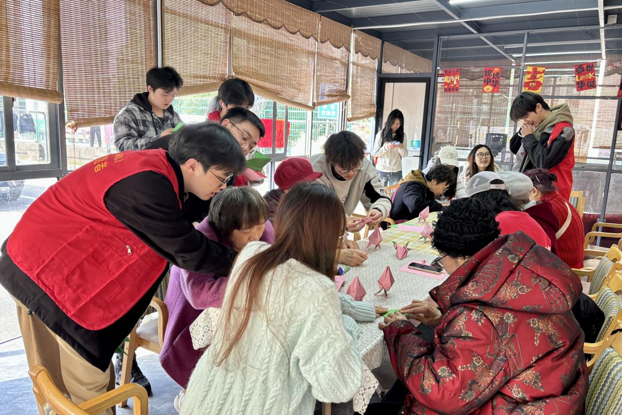 活动现场,同学们分工协作、各司其职,分为折纸组、手指操组、环保组、整理资料组、摄影组等,以多元形式践行志愿精神。折纸组耐心细致地教奶奶折叠寿桃等趣味造型,在指尖流转间传递温情与祝福;手指操组带领老人活动双手、舒展筋骨,在节拍律动中助力老人强身健体、愉悦身心。