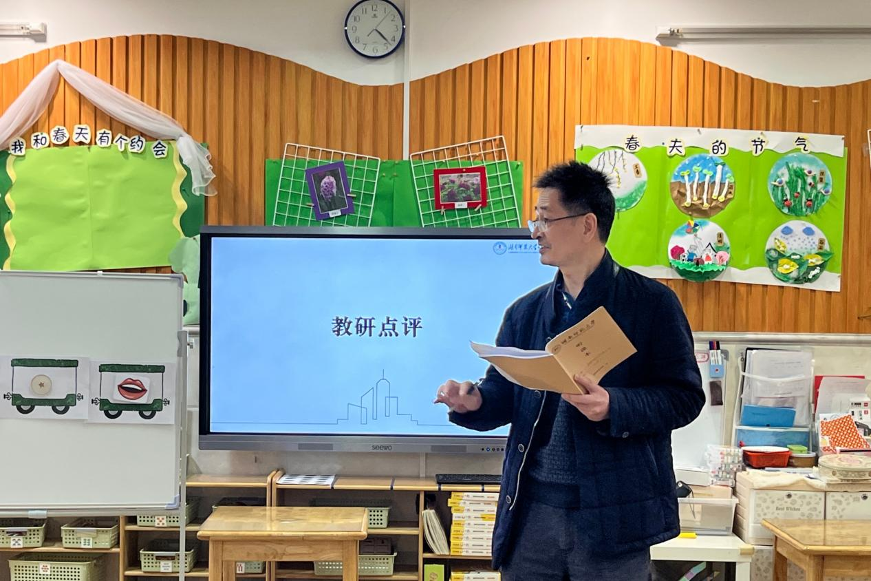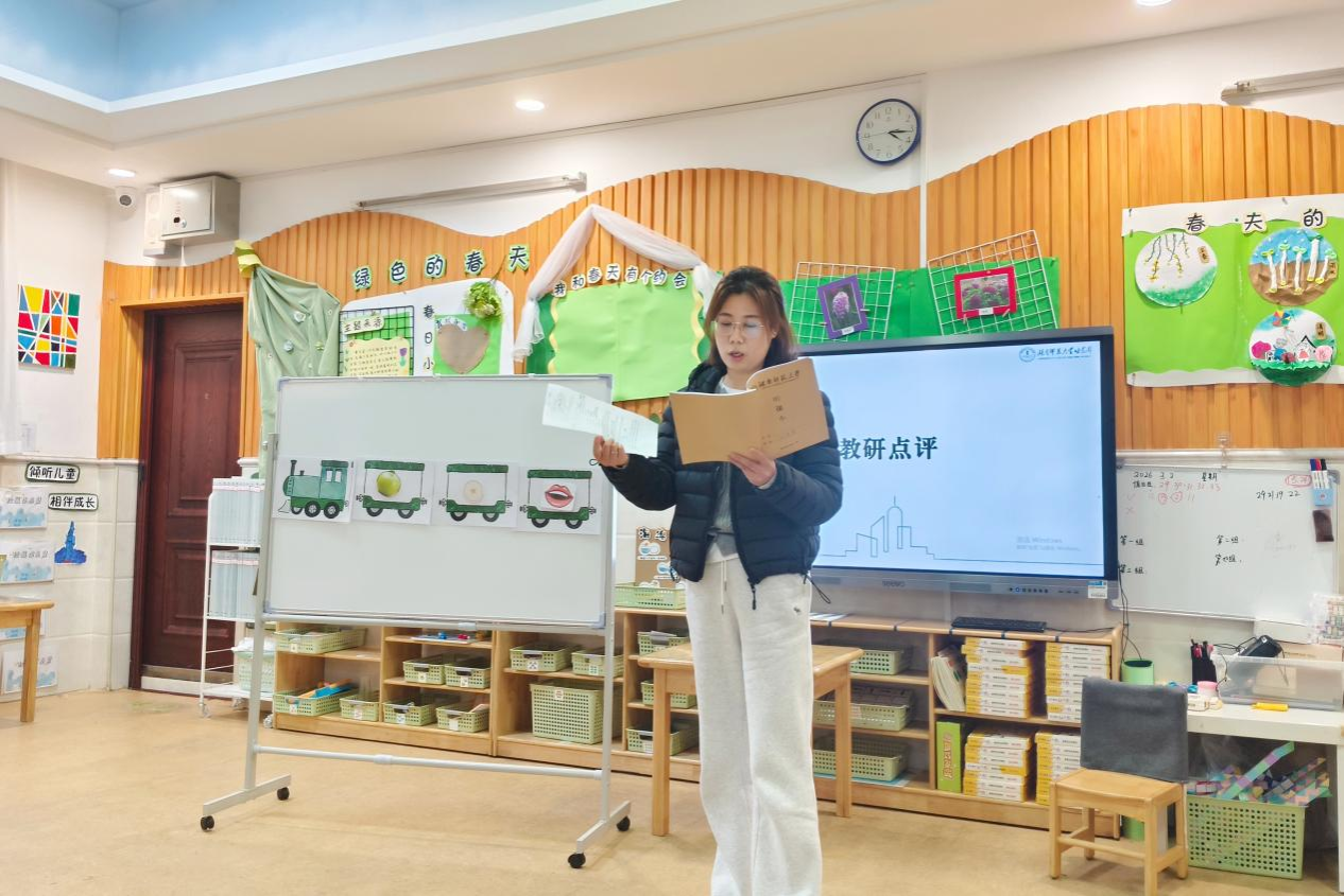 大二班班主任宁顺琴开展了大班数学活动《看你怎么猜》,引导幼儿用多种方法判断数字;中三班班主任付逸仙组织了中班语言活动《小熊的水果店》,借助“讲述小火车”支架引导幼儿有序描述水果特征。徐惠肯定了两位教师的教学表现,表示活动需以幼儿为中心,注重情境和游戏化教学;田景正、刘慧霞结合教育理论剖析教学设计,勉励实习生在反思探索中提升教学能力。