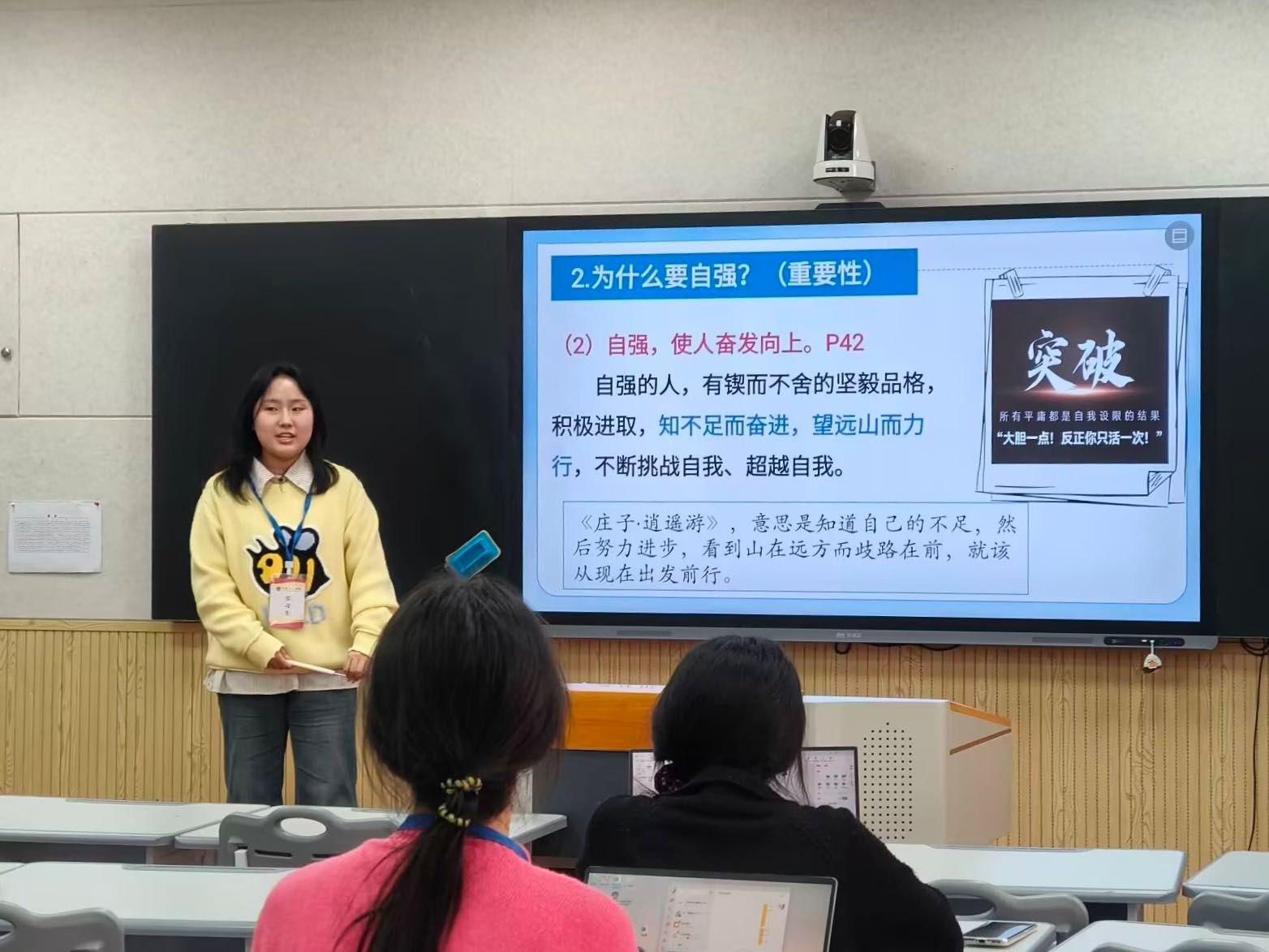 (通讯员 尹佳怡 杨玉婷)4月1日下午,明德天心实习队初一组开展《人生当自强》备课试讲活动,旨在打磨教学流程、提升教学能力。此次活动由304am永利集团实习队6名成员参与,明德天心中学初一组指导老师杨菲、杨敏进行点评指导。