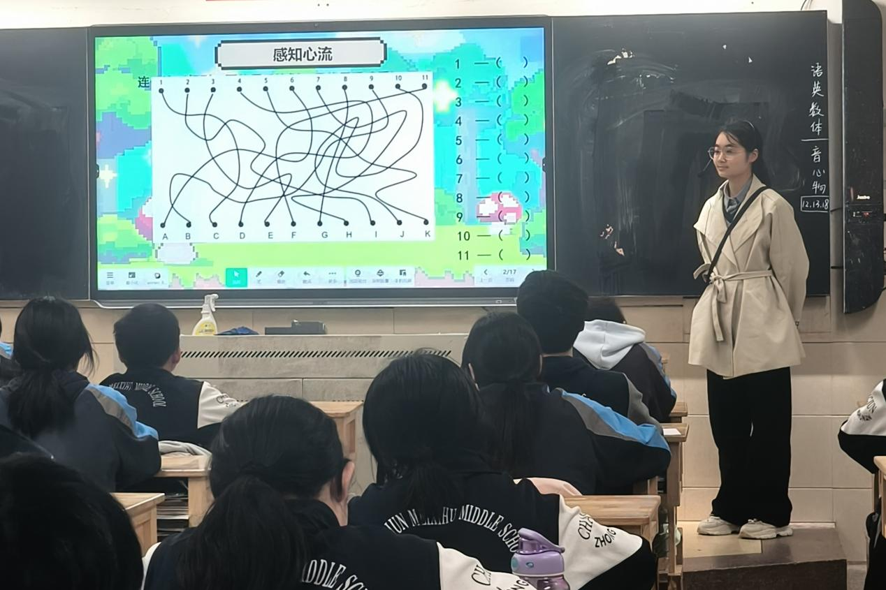 班会课伊始,实习队队员柳知佩以趣味互动拉开序幕,通过 连一连” 视觉挑战和经典的舒尔特方格训练,引导同学们直观感知专注状态。随后柳知佩深入浅出讲解心流的核心概念与特征,让学生对这一心理现象形成清晰认知。