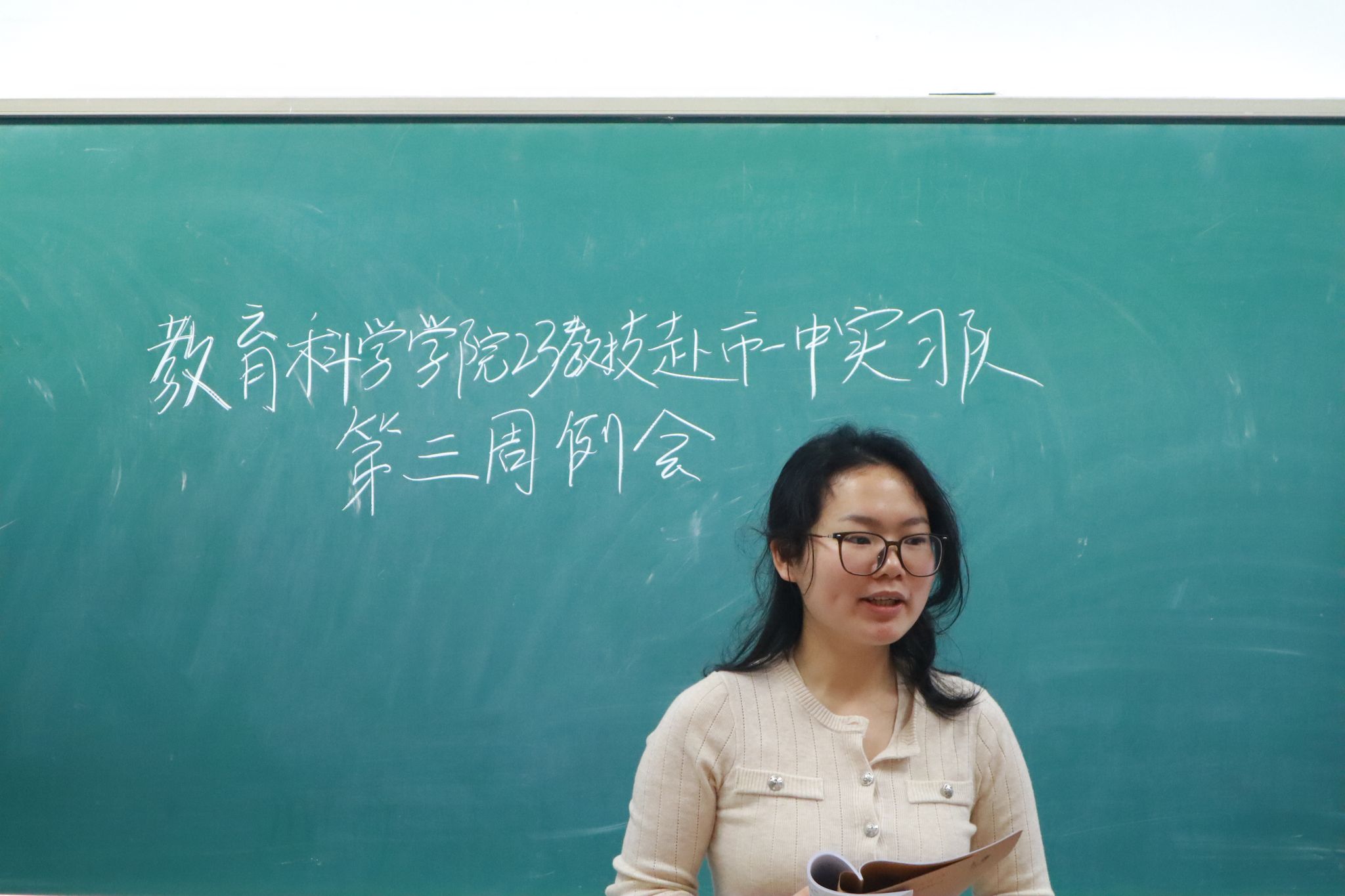 会上,申娜对实习队第二周的整体情况进行了简要总结。她指出,全体队员已完成首次授课,备课、宣传、卫生及考勤等各项工作均有序推进。她要求全体队员进一步规范个人言行