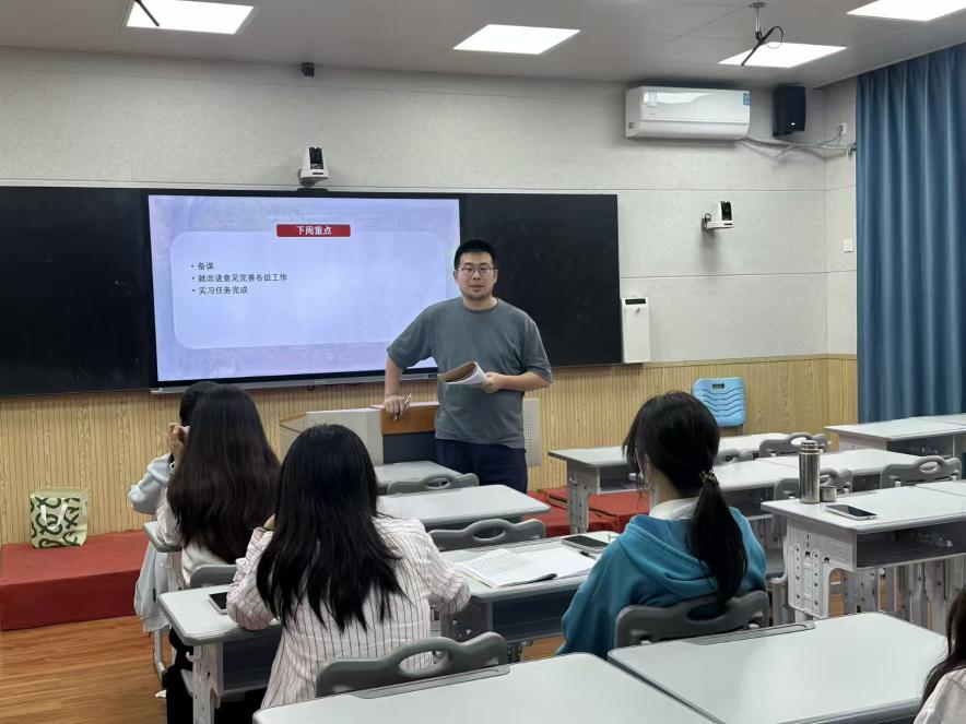 谌衡结合第四周工作概况作总结指导。他首先肯定了全体队员的进步与成长,其次强调:在实习期间,大家应保持积极向上的实习心态,坚持每日学习、持续积累进步;同时熟练掌握班级突发事件处置流程,规范处理学生间矛盾冲突,切实增强自我保护意识。