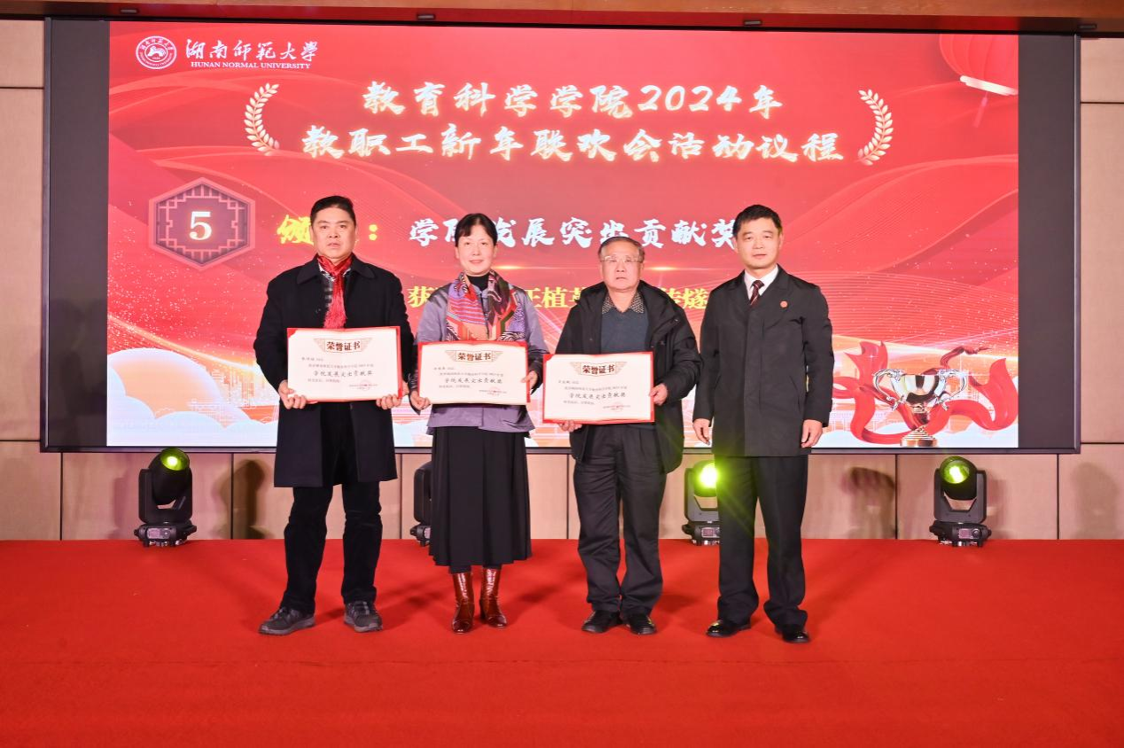 在大会表彰环节,刘铁芳向荣休教师汪植英、张传燧、燕良轼颁发“学院发展突出贡献奖”。院党委书记鲁良等院领导分别颁发“党建管理篇”的党建贡献奖、工会工作贡献奖”,“教育教学篇”的教学贡献奖、人才培养工作贡献奖、师范专业认证贡献奖,“学术科研篇”的科研贡献奖、师资建设贡献奖等七项表彰。