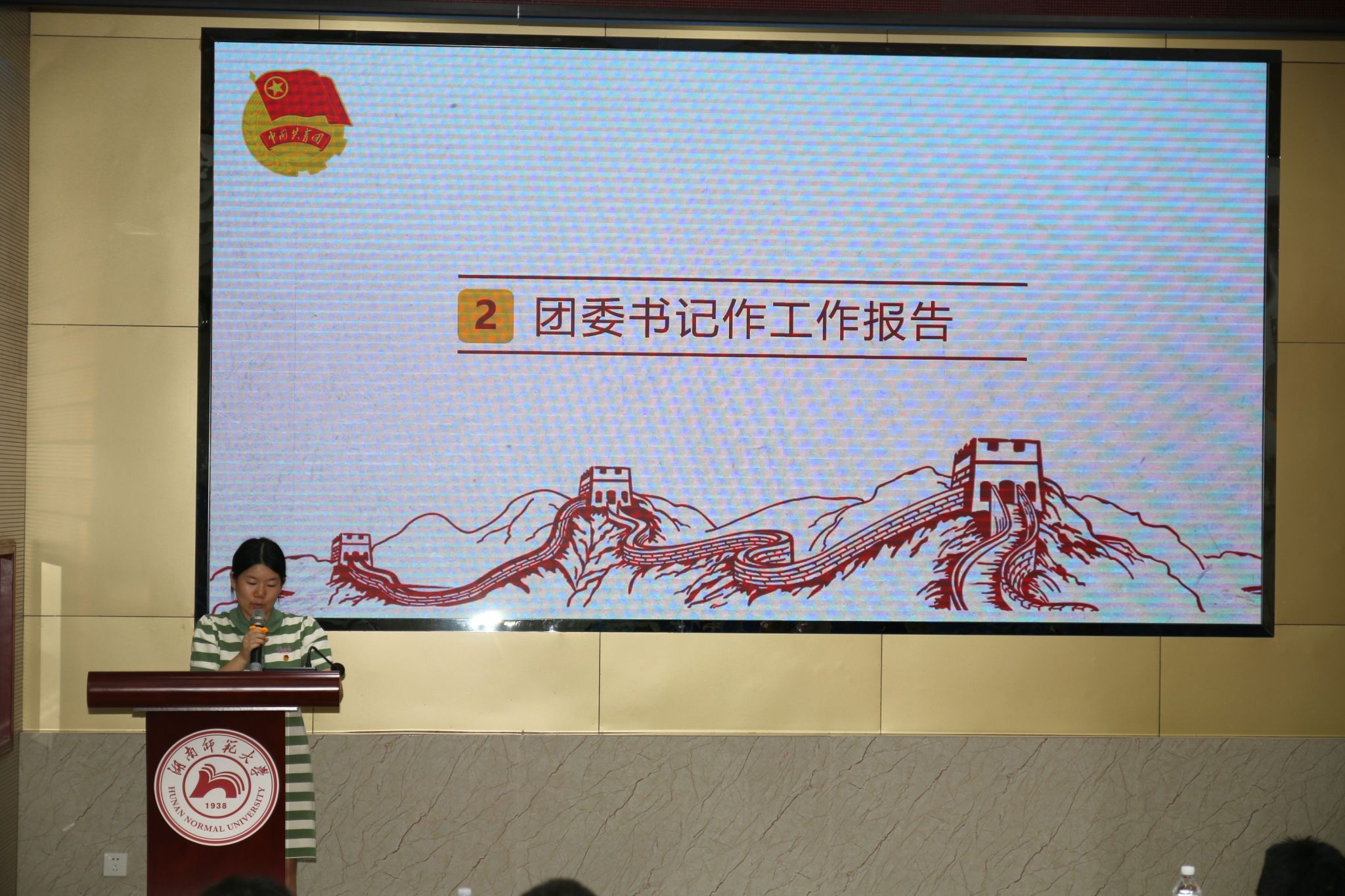 五四团内表彰环节在国歌声中拉开序幕。谭梦作团委工作报告。李雯婕宣读学院五四团内表彰决定后,由欧阳文芳和李雯婕共同为获奖代表颁奖。