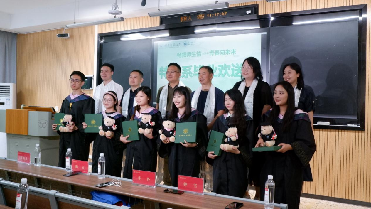 毕业典礼结束后,各会场举行“畅叙师生情,青春向未来”毕业欢送会,毕业生依次上台领取学院定制毕业礼品并与导师合影,各会场气氛热烈,师生交流、合影留念,传达对彼此的美好祝愿。