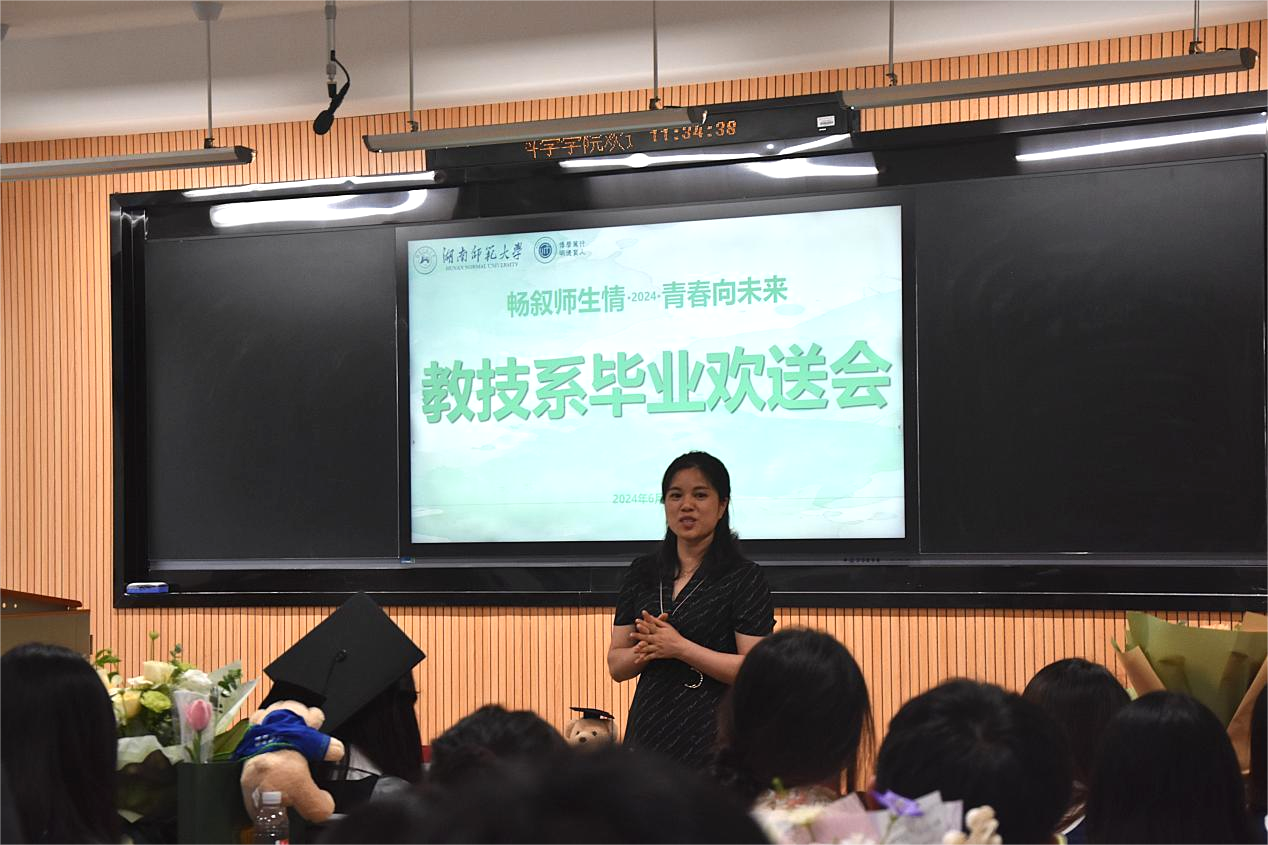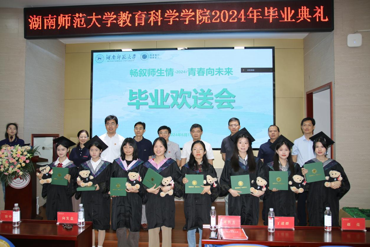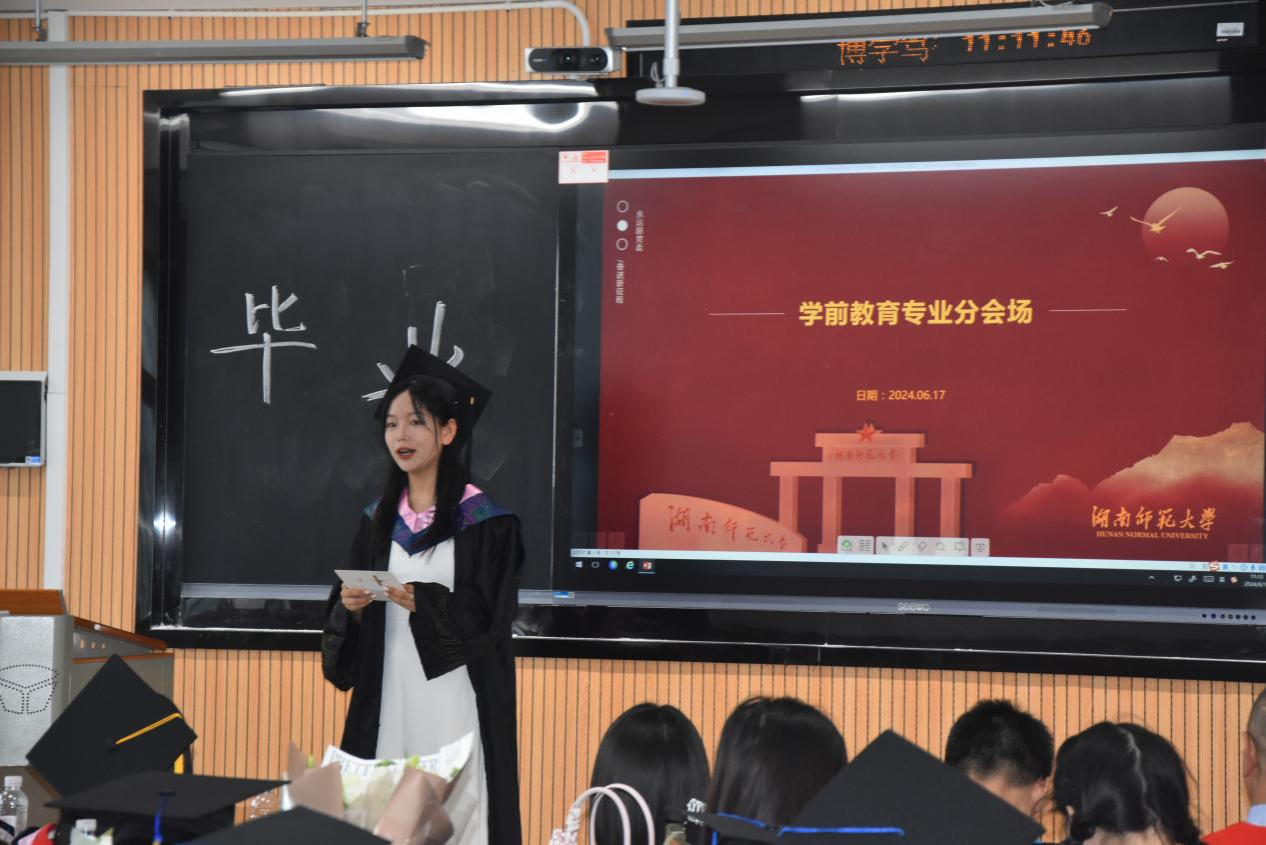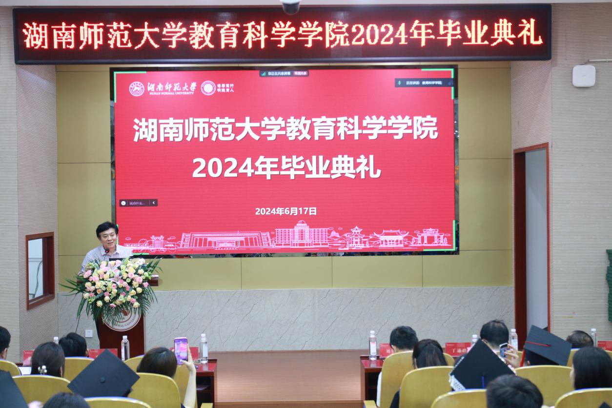 雄壮的国歌声拉开了典礼帷幕,党委副书记欧阳文芳宣读2024年省级、校级、院级优秀毕业生名单。本科生王艺橙、研究生杨菁菁作为毕业生代表发言,表达了对母校的感恩之情、对未来的希冀和建功新时代的决心。教育学系主任叶波代表全院教师用520字的发言表达对毕业生的爱与祝福。院长刘铁芳为2024届校友联络员颁发了聘书。