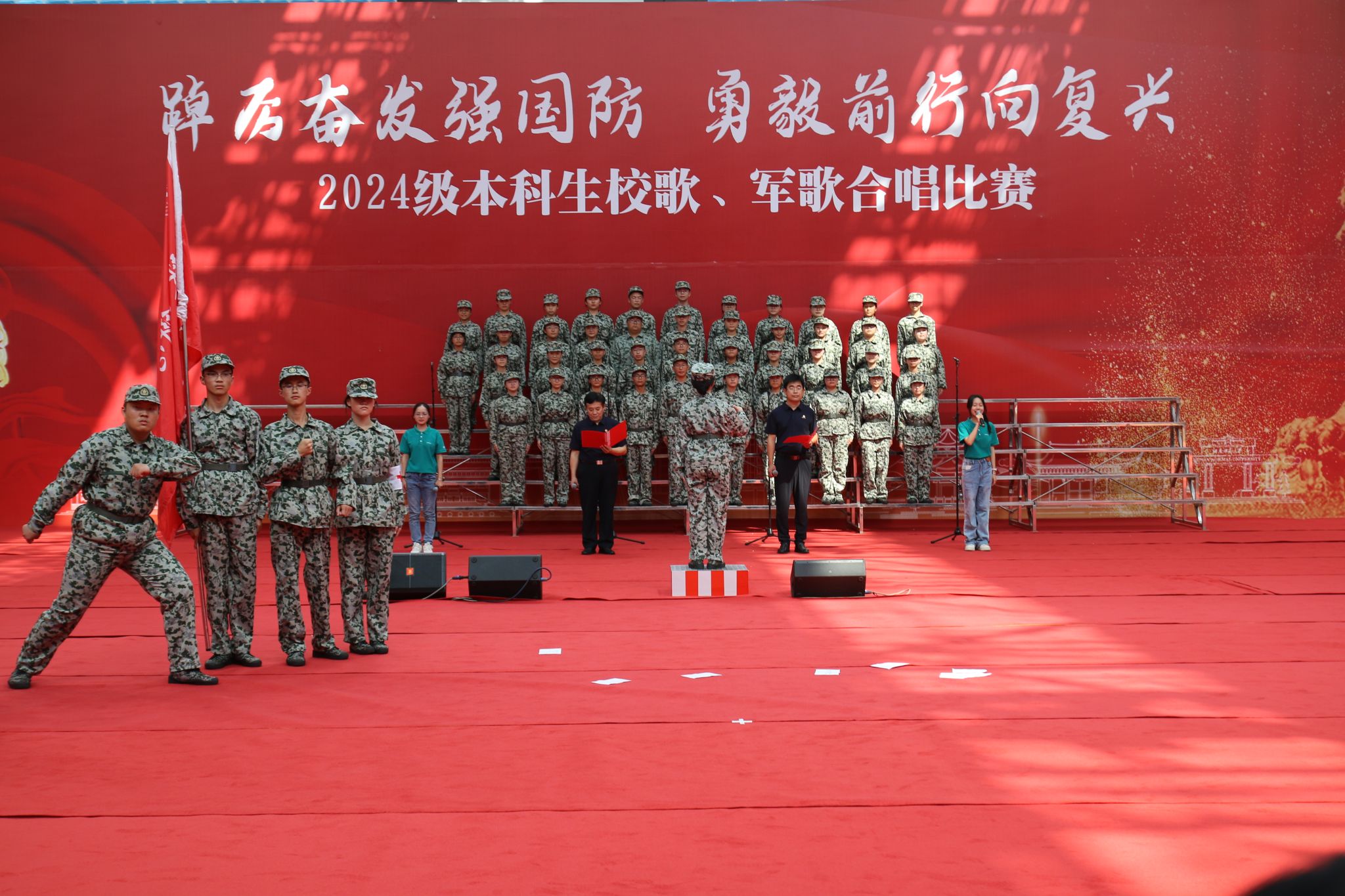 (通讯员 石新平 朱文倩)9月22日上午,学校2024级新生军训成果汇报暨总结表彰大会在二里半校区田径场举行。