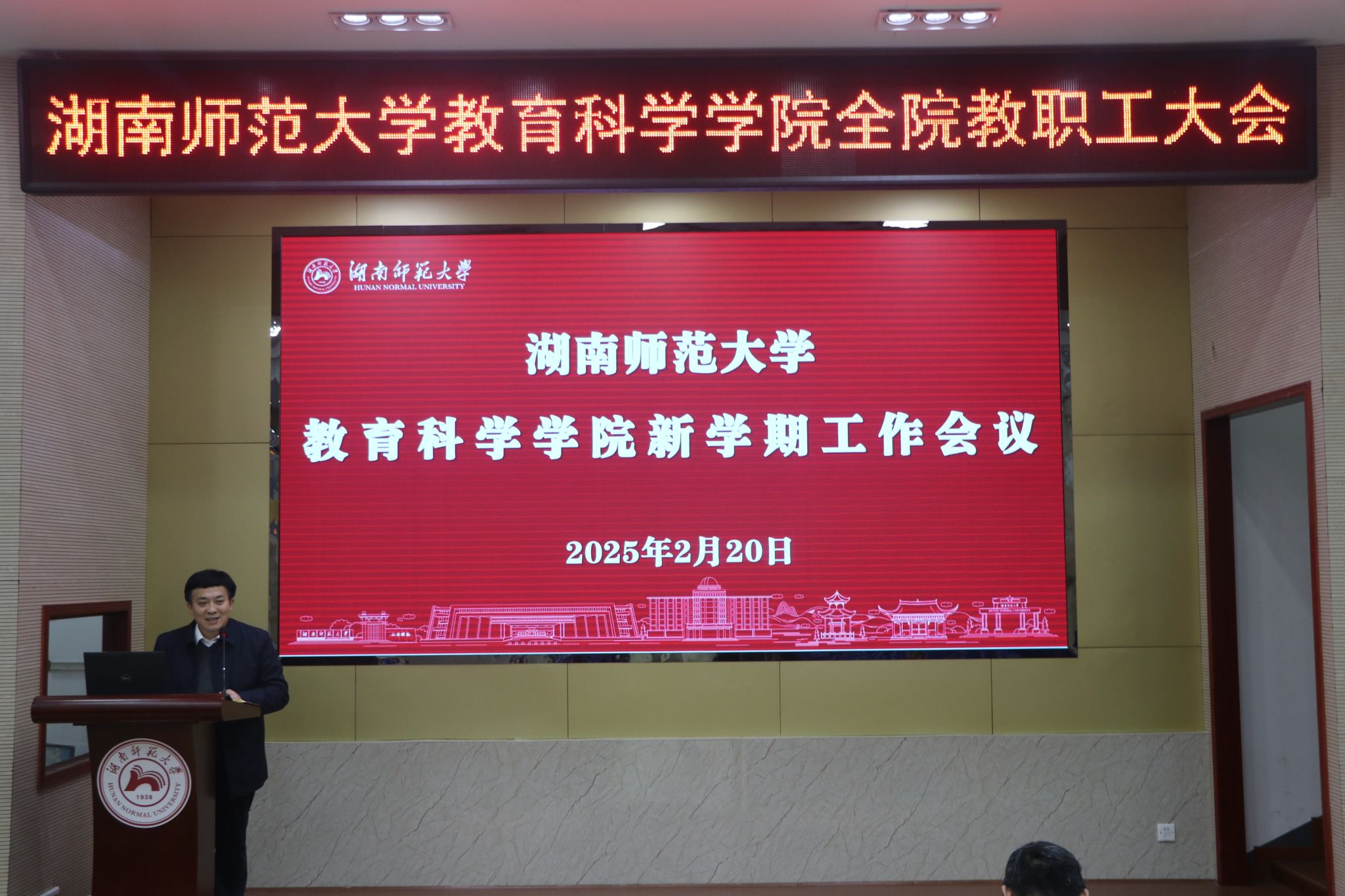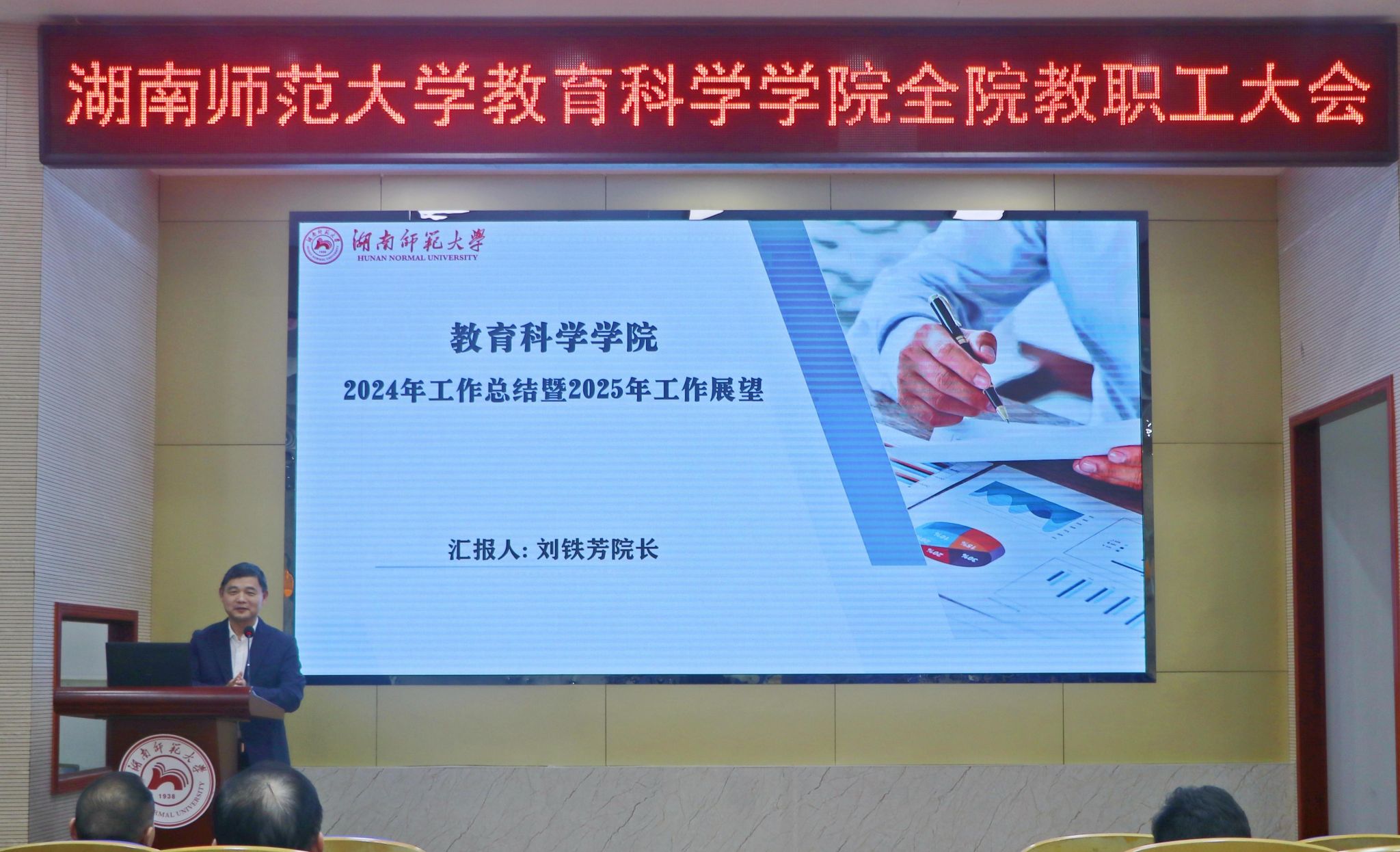 院长刘铁芳讲话,他传达了学校新学期工作会议的基本精神。他从人才队伍建设、人才培养质量、学科建设、创收工作四个方面总结了学院2024年的工作,对每一位教职工的辛勤工作和贡献表示了肯定和感谢。他结合学院实际情况,对新学期的工作目标和计划进行了部署:一是要以党的理论引领,促进学院发展与文化建设;二是要全力助推青年教师发展计划;三是要超越传统,对接需求,提升学科影响力;四是要提升人才培养质量,创新育人方式;五是要在空间、实践与管理中提升数字化教育;六是要创建尚学健体幸福学院,让每一位师生都能够健康平安幸福地工作和学习。