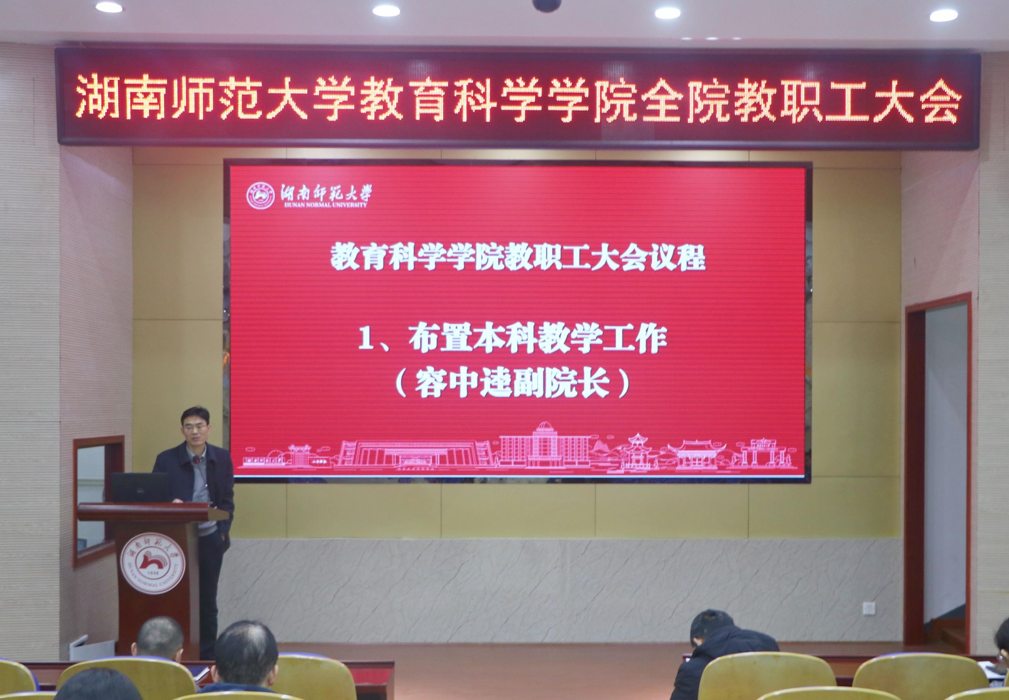 随后,副院长容中逵布置了新学期学院本科教学工作,对师范专业认证工作、考务材料归档、青年教师赛课、本科毕业论文答辩等各项工作进行了详细安排。