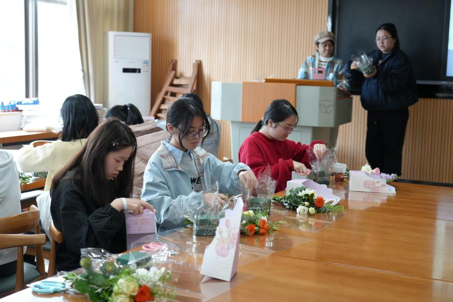 以花之名,与春有约。“花点浪漫”插花体验活动结合插花艺术与传统文化,通过插花实践、诗词互动等形式,帮助师生舒缓压力、提升审美情趣,同时增进情感交流。师生们在花艺师指导下创作个人花篮,一同感受自然之美、文化之韵。