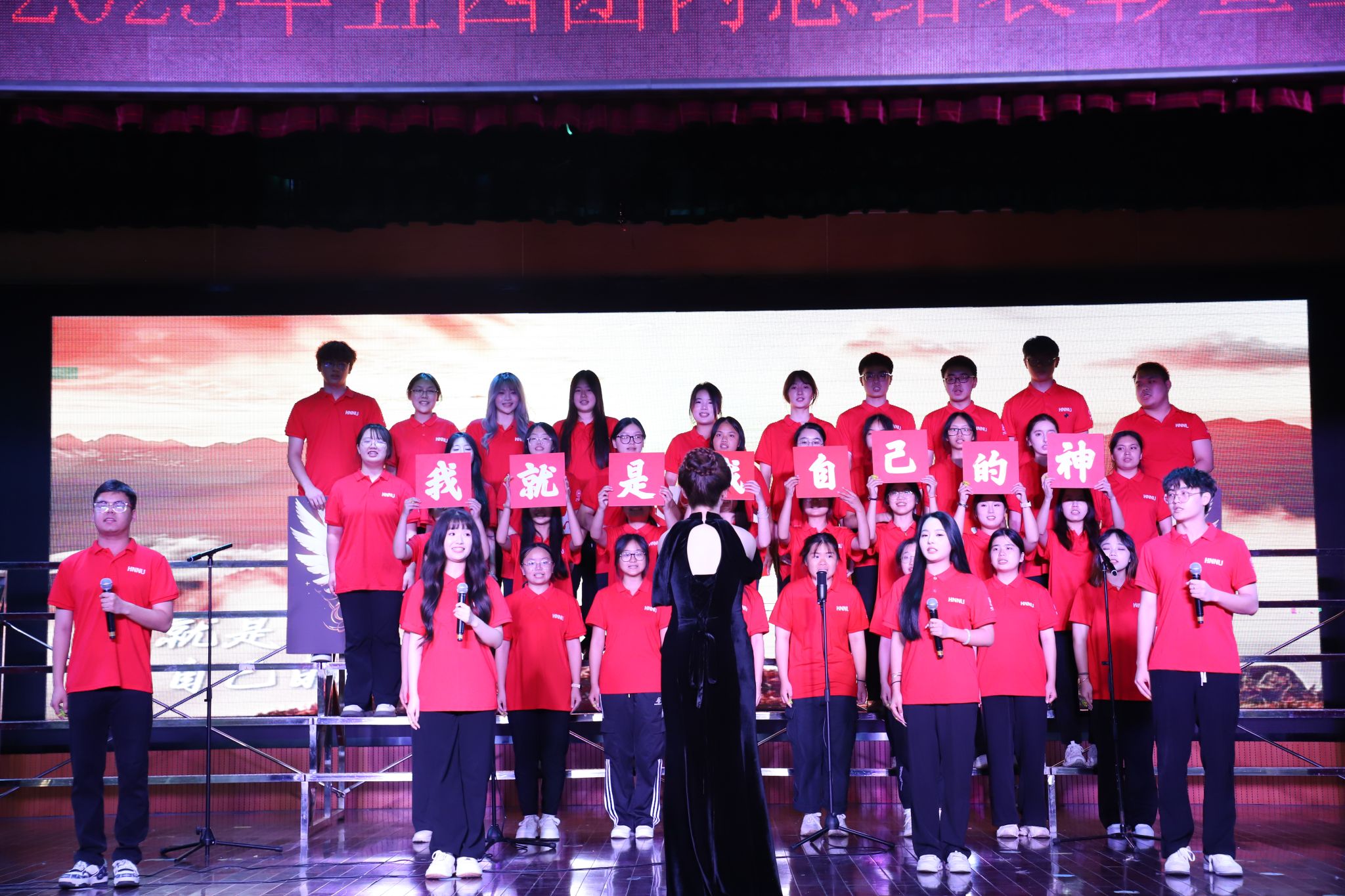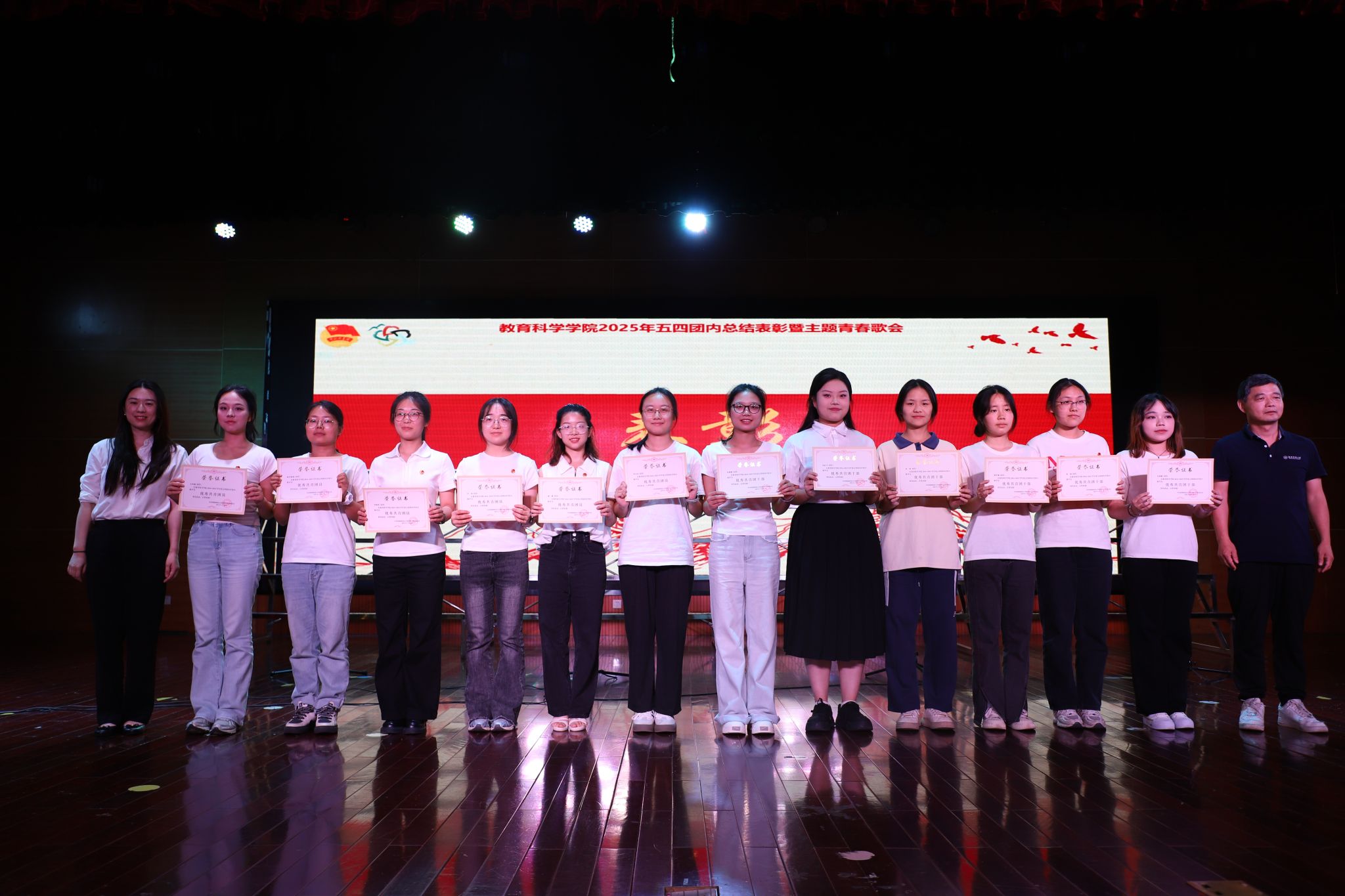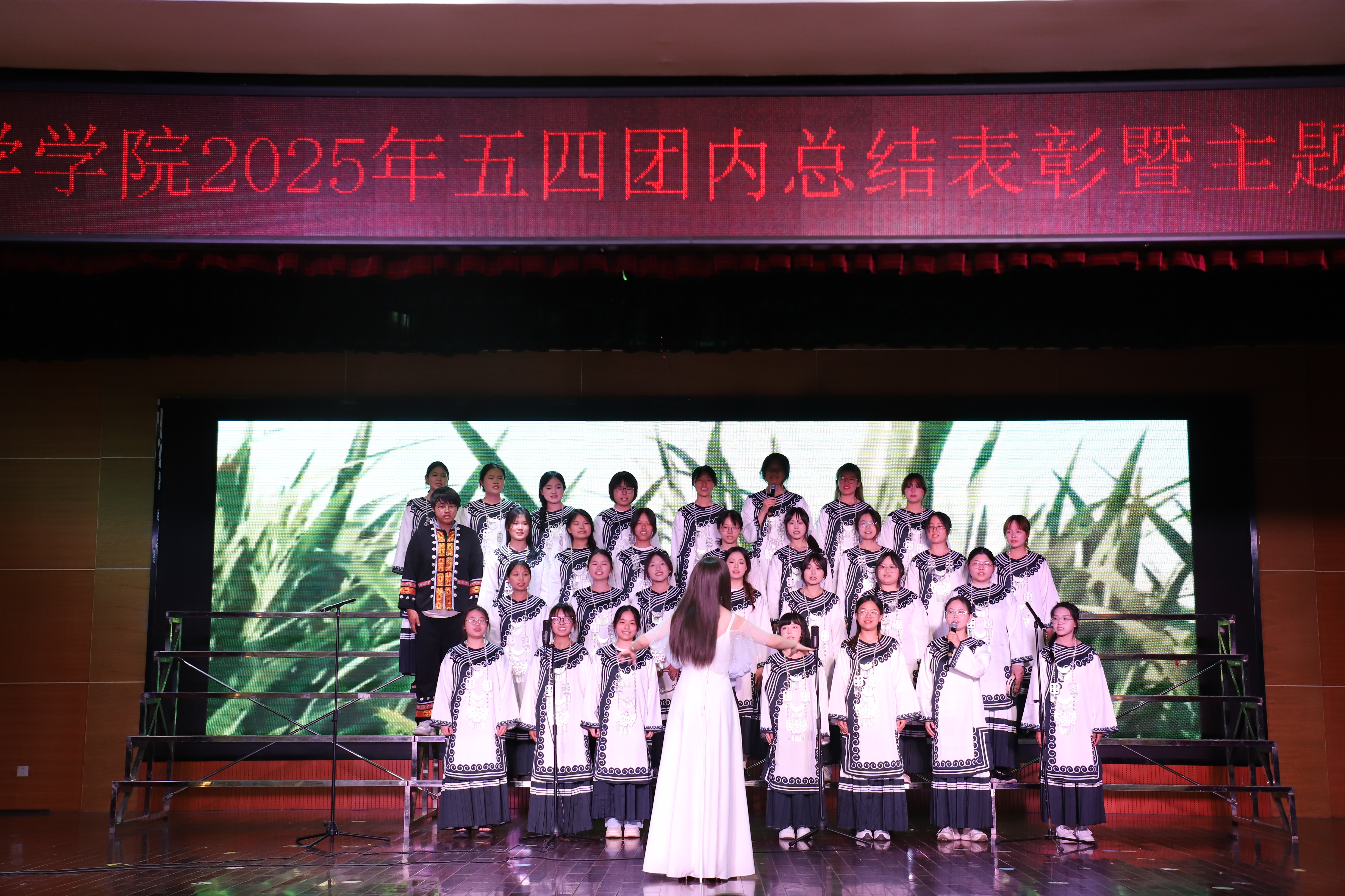 23级特殊教育班团支部完美演绎了自选曲目《玉盘》中月光般宁静悠远的意境,饱满的情感与自信的演唱展现了新时代青少年昂扬向上的精神风貌与深沉的民族自豪感。班导师陈杰老师更是亲自参与《强国一代有我在》的演唱,师生同心,唱响铮铮誓言;24级教育技术班团支部深情演绎《歌唱祖国》,用质朴歌词礼赞祖国壮丽山河,以蓬勃朝气表达对祖国光辉历程的敬意,引发全场观众自发合唱,气氛热烈感人;23级教育技术班团支部演唱《逐空》时,将坚定追梦、翱翔苍穹的意境诠释得淋漓尽致,音准稳健、气势磅礴,刘娟老师的深情朗诵更添一份激荡人心的力量;24级学前教育班团支部以《青春》为引,歌颂李大钊笔下“青春之中国、青春之民族”,以赤诚之声激励教科学子在民族复兴的征程中,以奋斗之姿书写无悔青春。