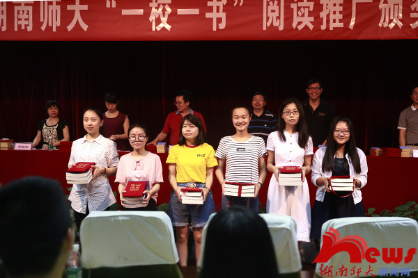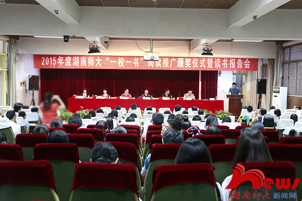 鄢朝晖宣读了我校2015年度“一校一书”阅读推广活动评选结果。主席台就坐的领导嘉宾为获奖单位代表和个人颁奖。