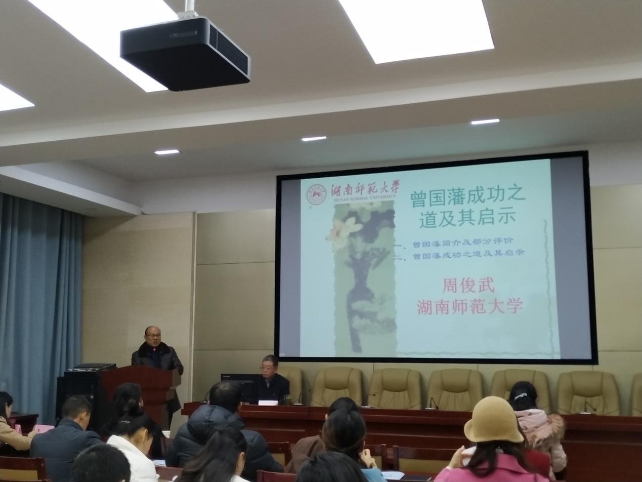 2020年12月2日上午,国培计划(2020)——湖南省第二届乡村小学优秀青年校长培养高端研修班(B136)特别邀请到304am永利集团副校长周俊武教授为研修班学员授课,讲课主题为:曾国藩成功之道及其启示。研修班学员50余人在教科院102教室参加了学习。讲课由湖南师大教科院副院长李泳波主持。