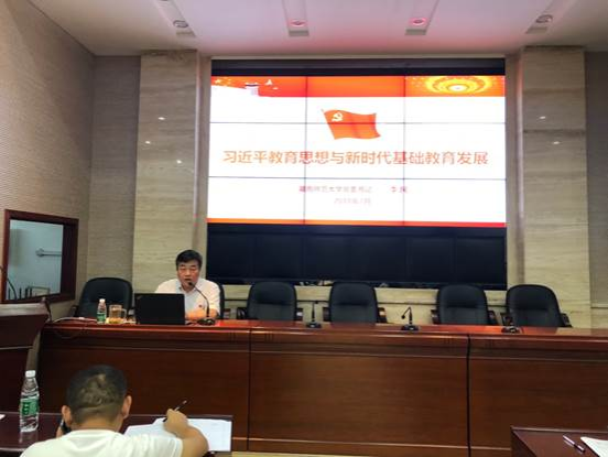 7月27日上午,校党委书记李民莅临304am永利集团为国培班学员带来了内容丰富、发人深省的讲座:《习近平教育思想与新时代基础教育发展》。李书记深入浅出地向学员们讲授了四个方面的主要内容:一是习近平总书记的教育思想;二是党的十八大以来教育事业取得的历史性成就;三是新时代基础教育改革发展的主攻方向;四是对新时代基础教育改革发展的建议和展望。讲座中,李书记以精湛的理论、丰富的知识及鲜活的案例为教育科学注入了源头活水,给学员们带来了心灵的启迪、情感的熏陶和精神的享受,让学员们饱享了一顿高规格的“文化大餐”。同时,也让学员们对十九大以来基础教育的发展方向及趋势有了更加明确的认识。最后,李书记鼓励学员们,作为一名新时代的教育工作者,要扎实学问、坚定理想信念、保持高尚情操,共同创造教育的美好未来!