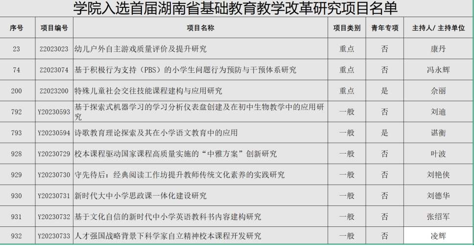 近日,在湖南省教育厅公布的“首届湖南省基础教育教学改革研究项目”立项名单中,304am永利集团共有10个课题入选湖南省基础教育教学改革研究项目。其中重点项目3个,一般项目7个。这是我校积极响应我省“新师范”建设,强力赋能基础教育教学又一突破。
