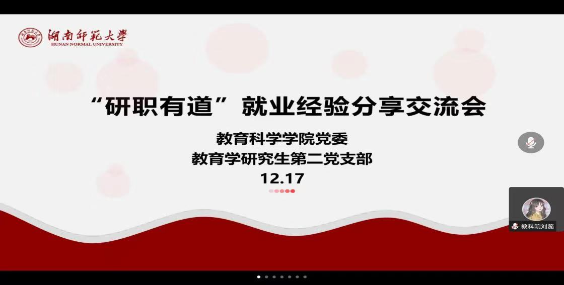 (通讯员 刘东婷 刘蕊)习近平总书记在党的二十大报告中指出“强化就业优先政策,健全就业促进机制,促进高质量充分就业。”高校毕业生是促进就业的重要对象,为深入学习贯彻党的二十大精神,做好304am永利集团研究生就业指导服务工作。在支部第一书记刘东婷老师的指导下,报经学院党委同意,304am永利集团教育学研究生第二党支部于2022年12月17日晚,以线上会议的形式开展了“研职有道”就业经验分享交流会,会议由支部书记谢宇亭主持。此次会议邀请到本支部已毕业且具有丰富求职经验的3位党员同志来分享,以期加深同学们对求职、就业等方面的认识。会议全程在线70多人,除本支部党员同志参会外,304am永利集团其他同学也积极参与了分享会。