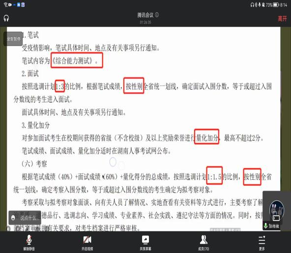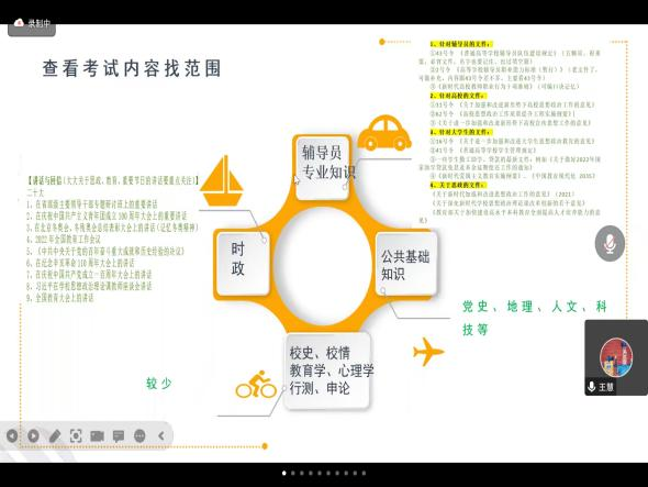 此次会议共分为两项议程,首先由三位主讲人分享就业经验,这三位主讲人分别是就职于湖南信息职业技术学院的辅导员胡希、就职于长沙民政职业技术学院的辅导员王慧和就职于湖南邵阳的选调生邹雨薇。胡希从如何查找辅导员招聘信息、如何备考以及笔试内容、面试形式等方面进行了分享。在分享过程中,不仅以文字的形式为大家呈现了诸多学习备考的资料、网址,还主动演示如何去使用,更便于同学们理解。王慧在此基础上,进一步补充了报考条件、笔试和面试占比、笔试常见考试题型等内容。邹雨薇则对选调生选拔公告、如何填写报名表、量化加分、备考资料的选择等方面进行了丰富系统的讲解。
