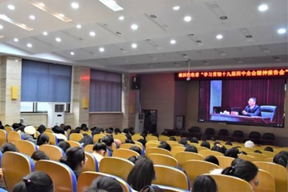 (通讯员 于抒含 童金宇 易芳莹)11月28日下午,学校举行了“学习贯彻党的十九届四中全会精神省委宣讲团报告会”。报告会的主会场设在学校国际学术报告厅,并在学校网站进行了同步直播。学院班子成员、部分学生和教师代表到主会场聆听报告,学院党委组织党员和入党积极分子在学院101报告厅收看了直播。
