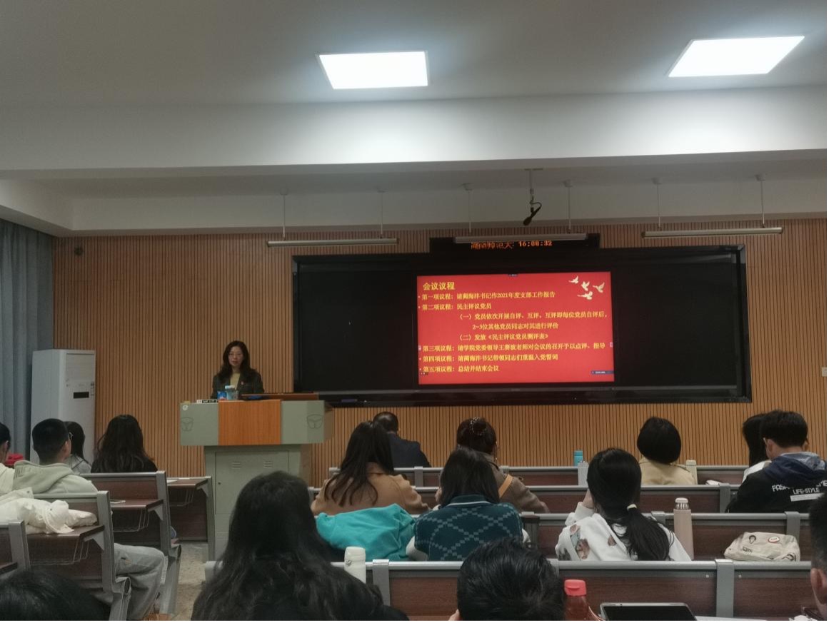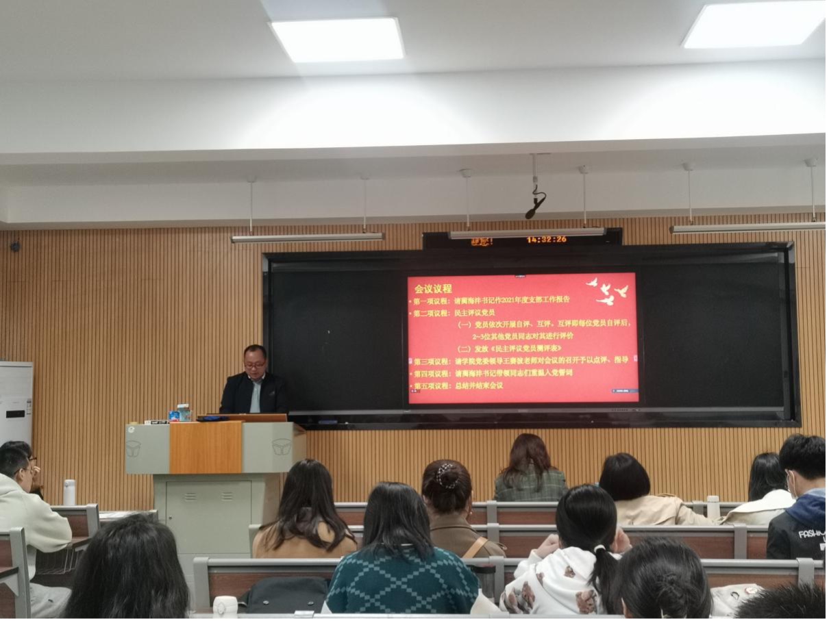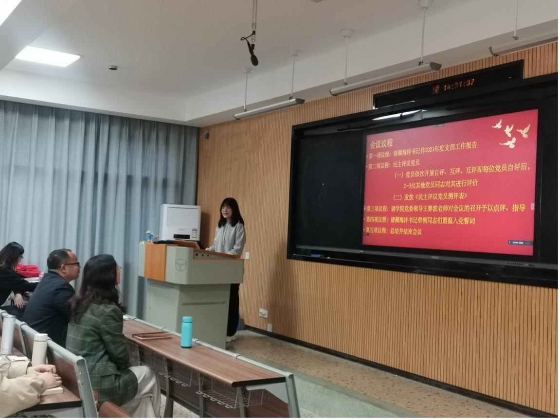 首先,支部书记蔺海沣报告了一年以来党支部的工作情况,代表支委会作对照检查,总结成绩,检视不足。从2021年度支部党员队伍建设情况、支部会议召开情况、党员学习教育情况、党员发挥先锋模范带头作用情况、支部工作经验总结与问题反思等方面做了详细的汇报。