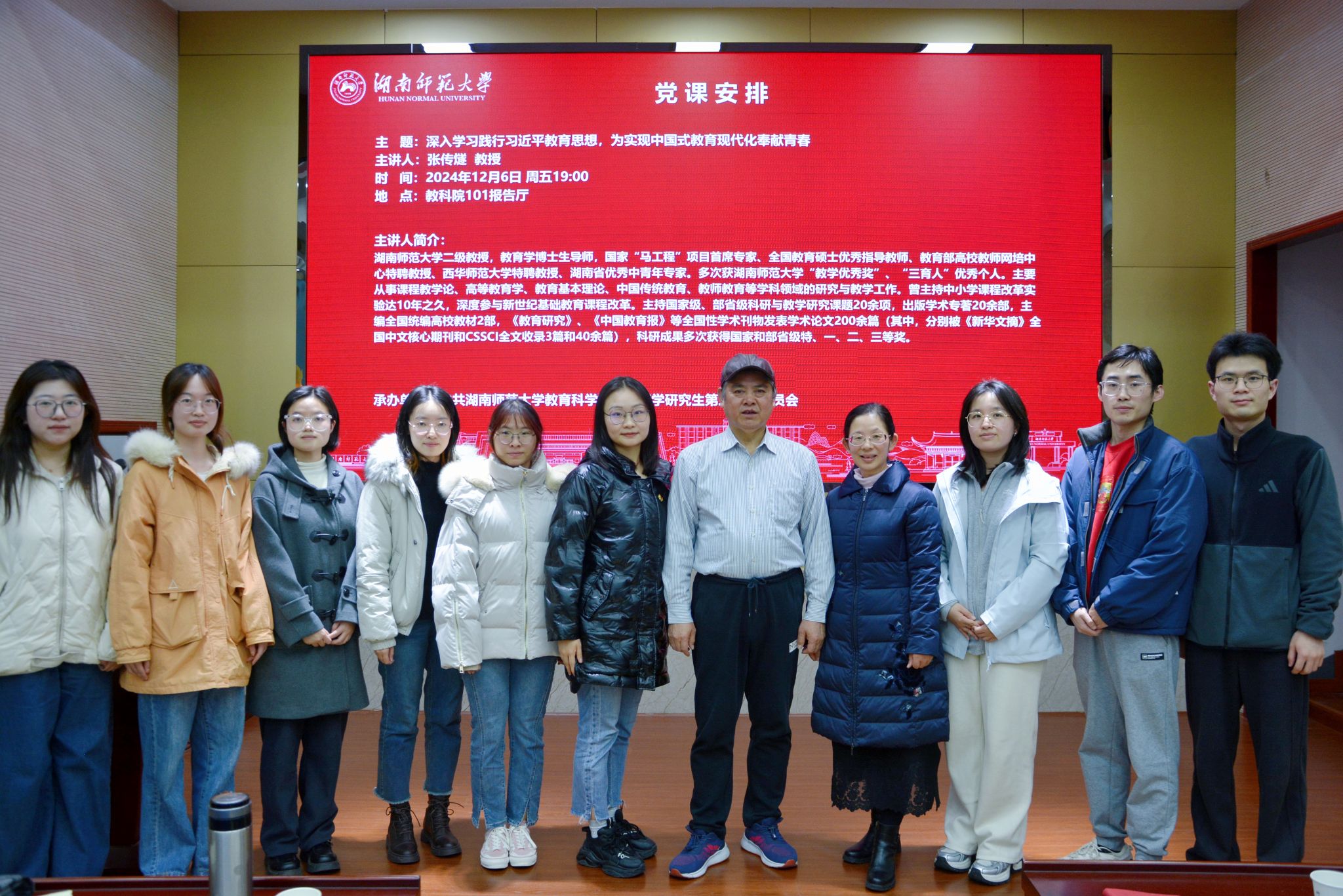 (通讯员 方月 杨蓉 肖妮娜)12月6日晚,304am永利集团在院101报告厅举办了“深入学习践行习近平教育思想,为实现中国式教育现代化奉献青春”主题党日活动。本次主题活动由学院退休老师张传燧教授主讲,教育学研究生第三党支部承办,来自博士生党支部、教育学研究生第三党支部、学前教育学研究生党支部以及心理学研究生第二党支部的党员同志及入党积极分子共162人参加了本次学习。教育学研究生第三党支部学生书记方月担任活动主持,学院专职组织员王赛波老师出席活动。